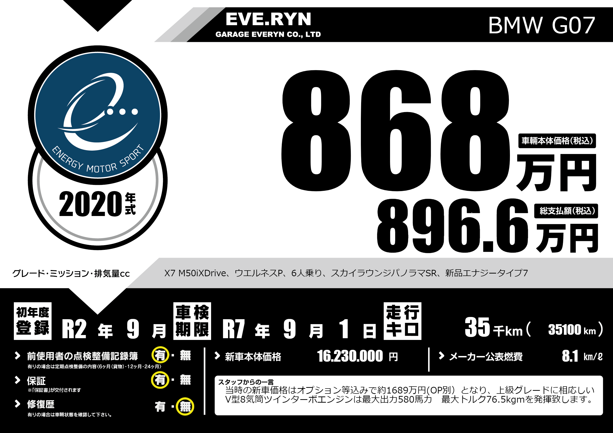 | 車名 | BMW G07 | グレード ミッション 排気量 |