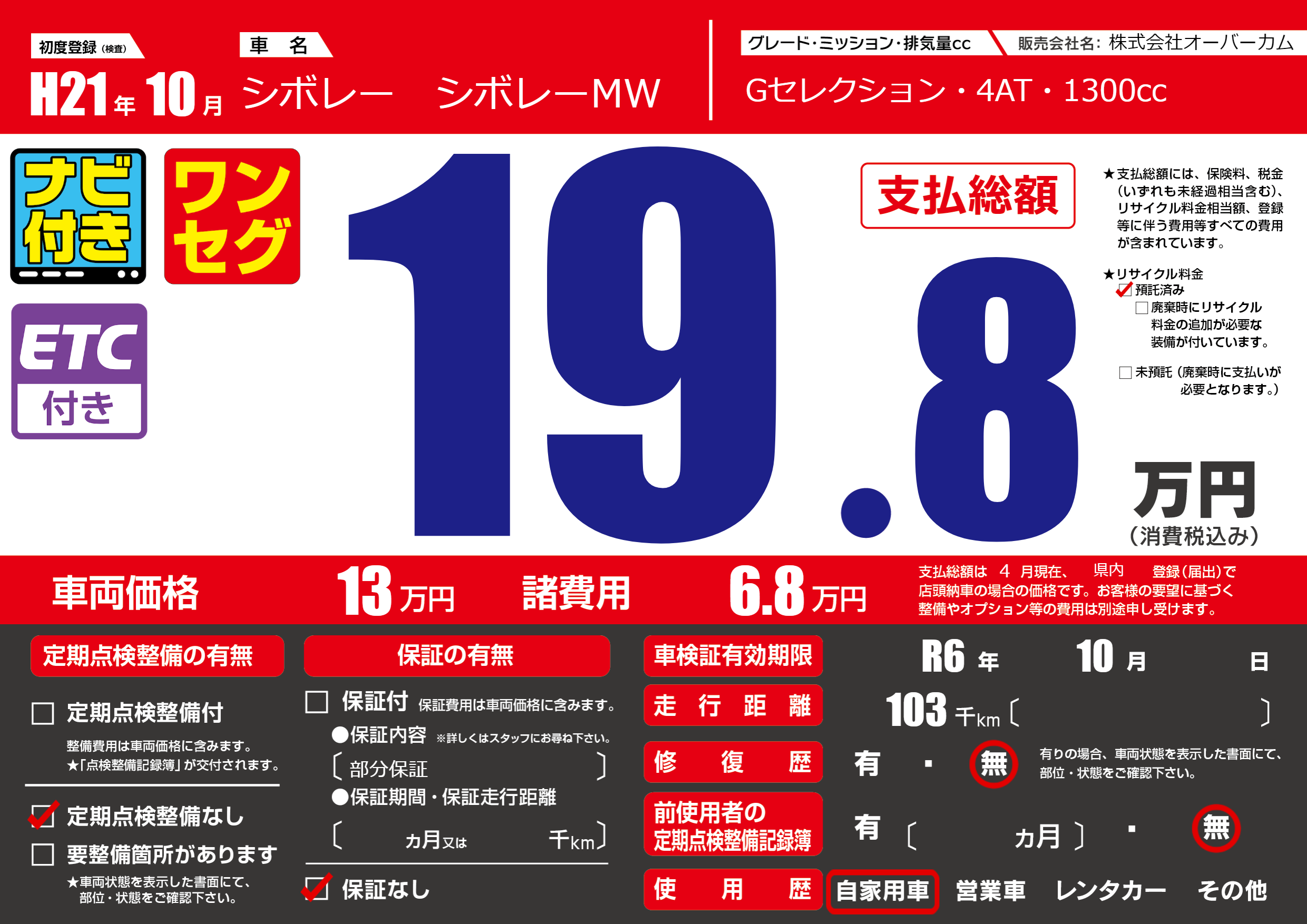 | 車名 | シボレー シボレーMW | グレード ミッション 排気量 |