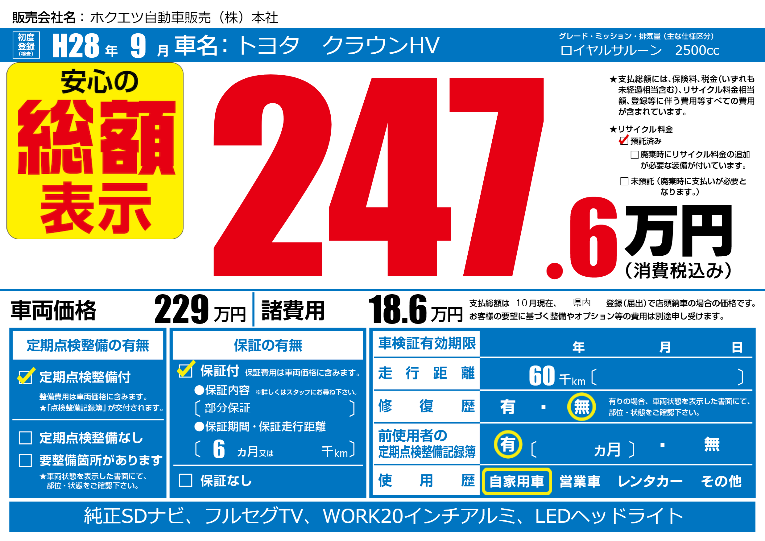 | 車名 | トヨタ クラウンHV | グレード ミッション 排気量 |