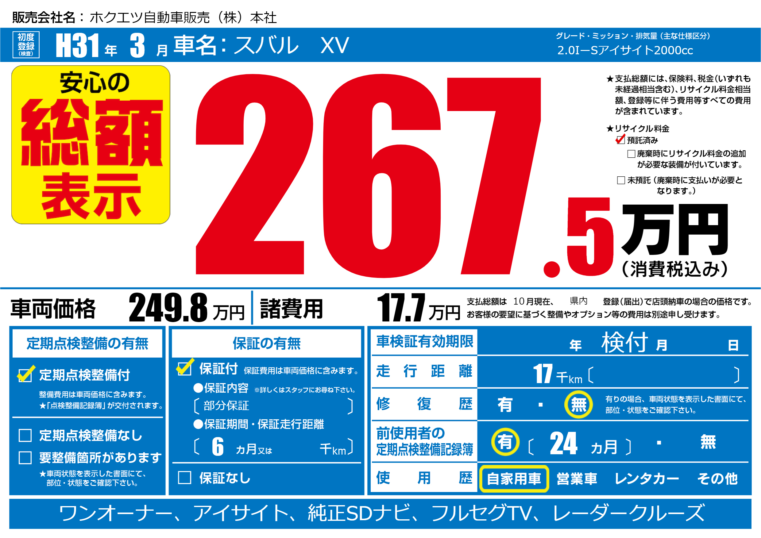 | 車名 | スバル XV | グレード ミッション 排気量 |