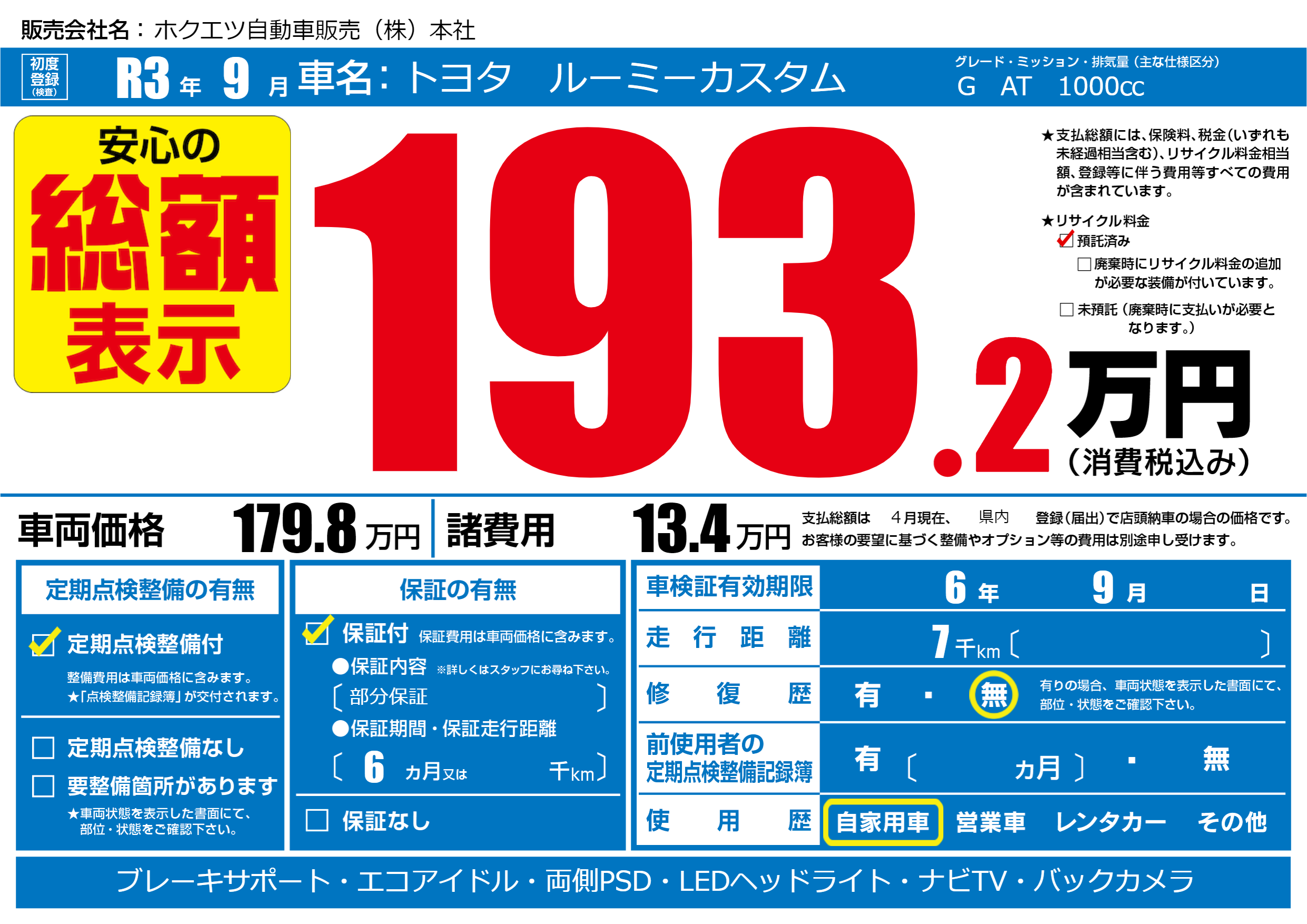 | 車名 | トヨタ ルーミーカスタム | グレード ミッション 排気量 |
