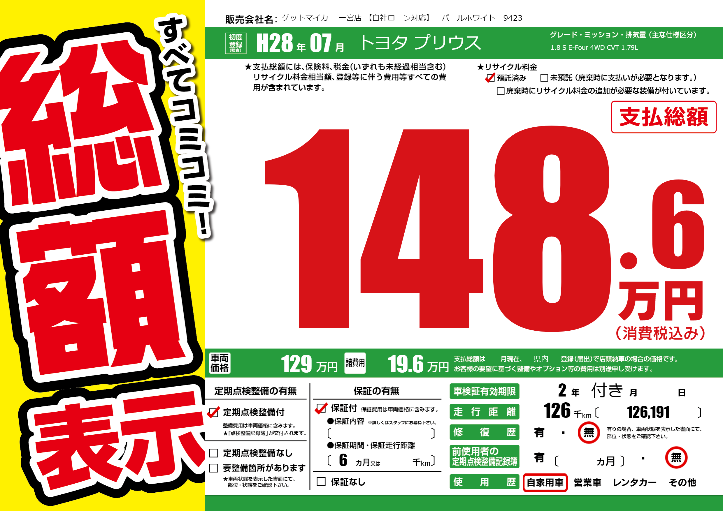 | 車名 | トヨタ プリウス | グレード ミッション 排気量 |