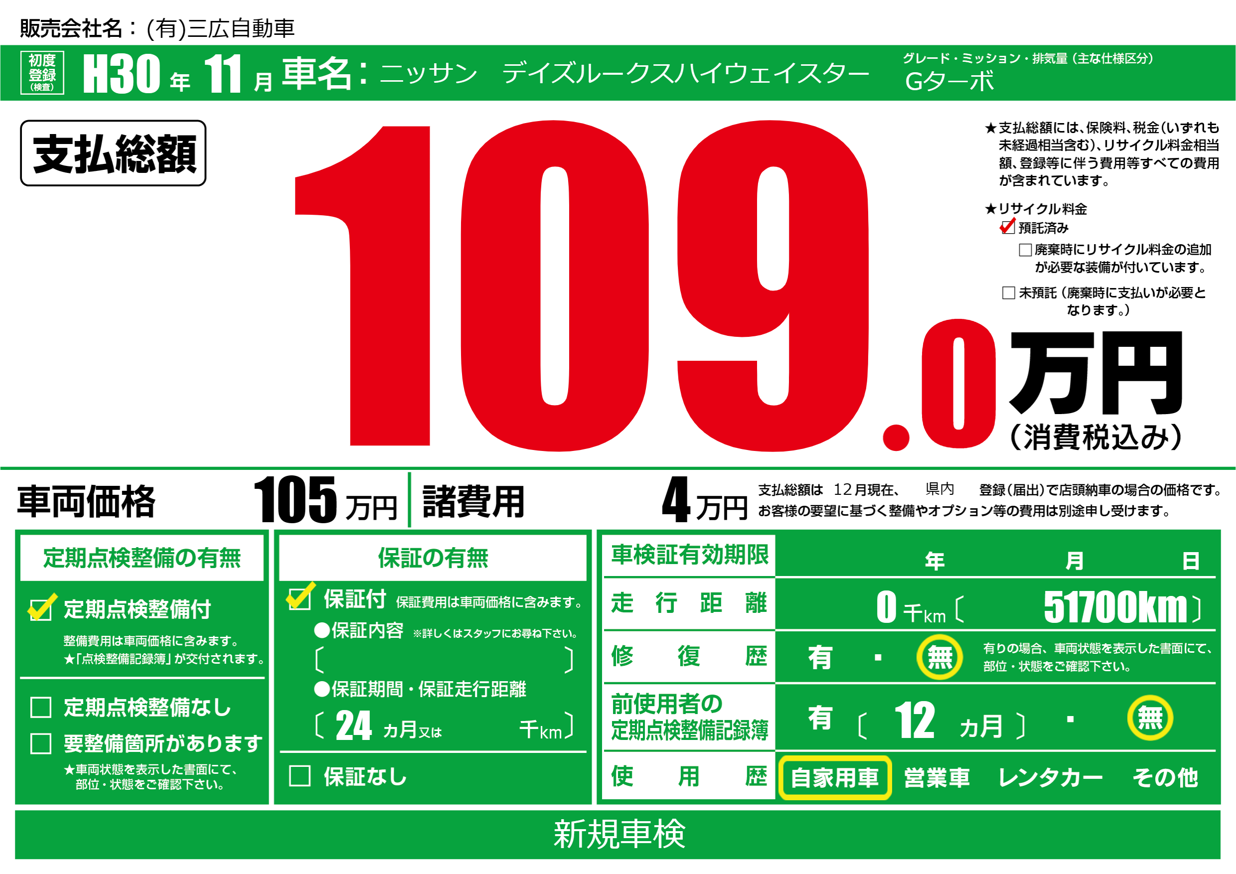 | 車名 | ニッサン デイズルークスハイウェイスター | グレード ミッション 排気量 |