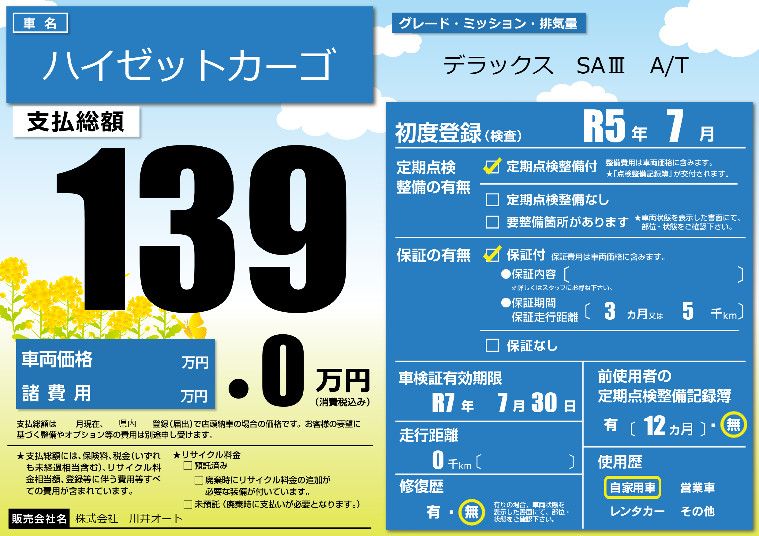 | 車名 | ハイゼットカーゴ | グレード ミッション 排気量 |