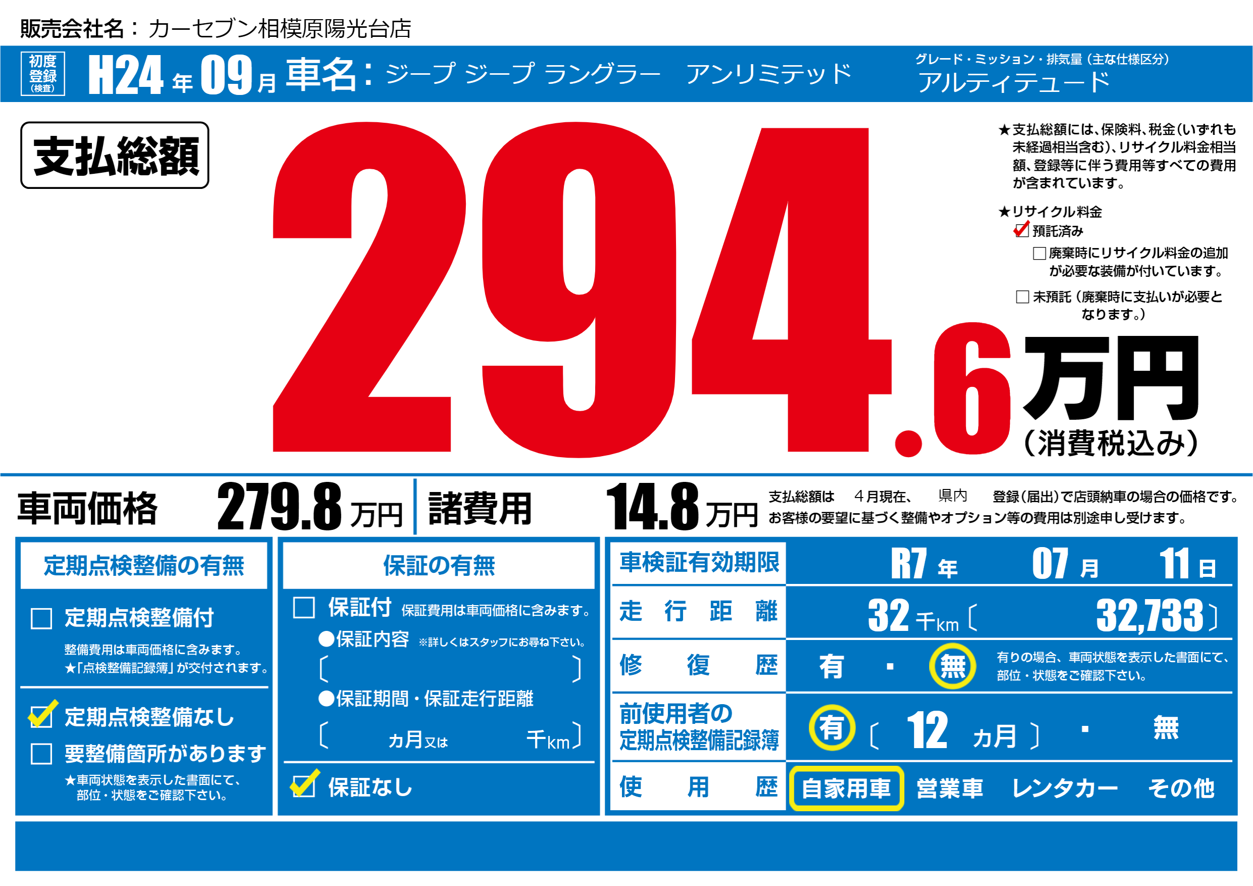 | 車名 | ジープ ジープ ラングラー アンリミテッド | グレード ミッション 排気量 |