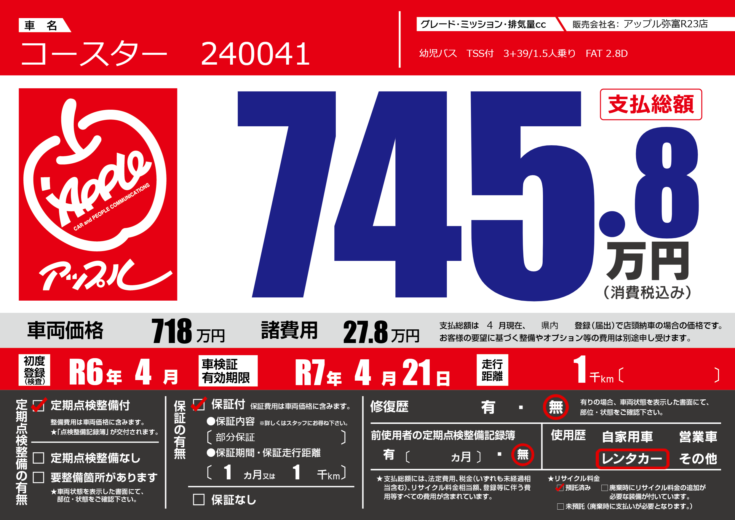 | 車名 | コースター 240041 | グレード ミッション 排気量 |