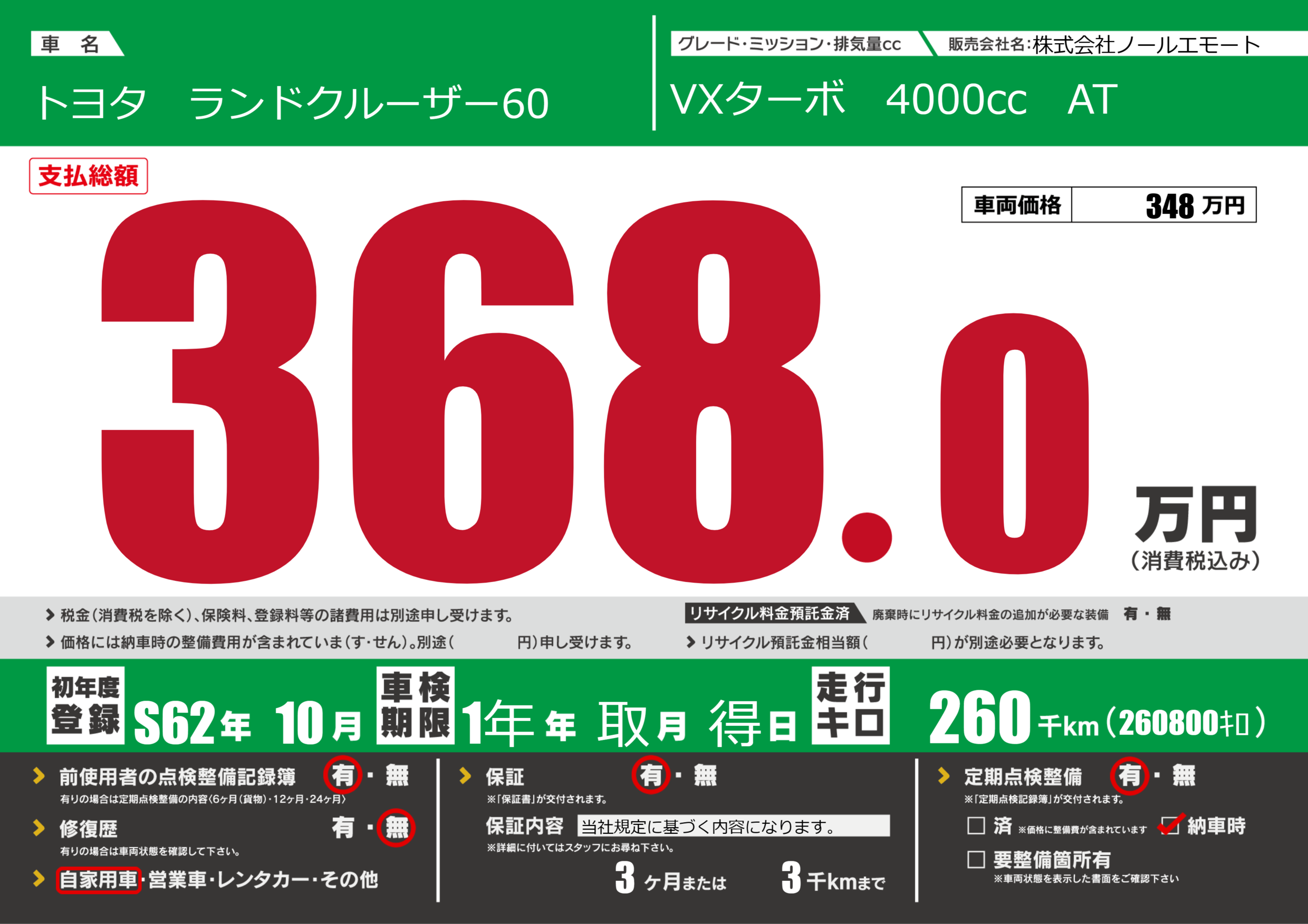 | 車名 | トヨタ ランドクルーザー60 | グレード ミッション 排気量 |
