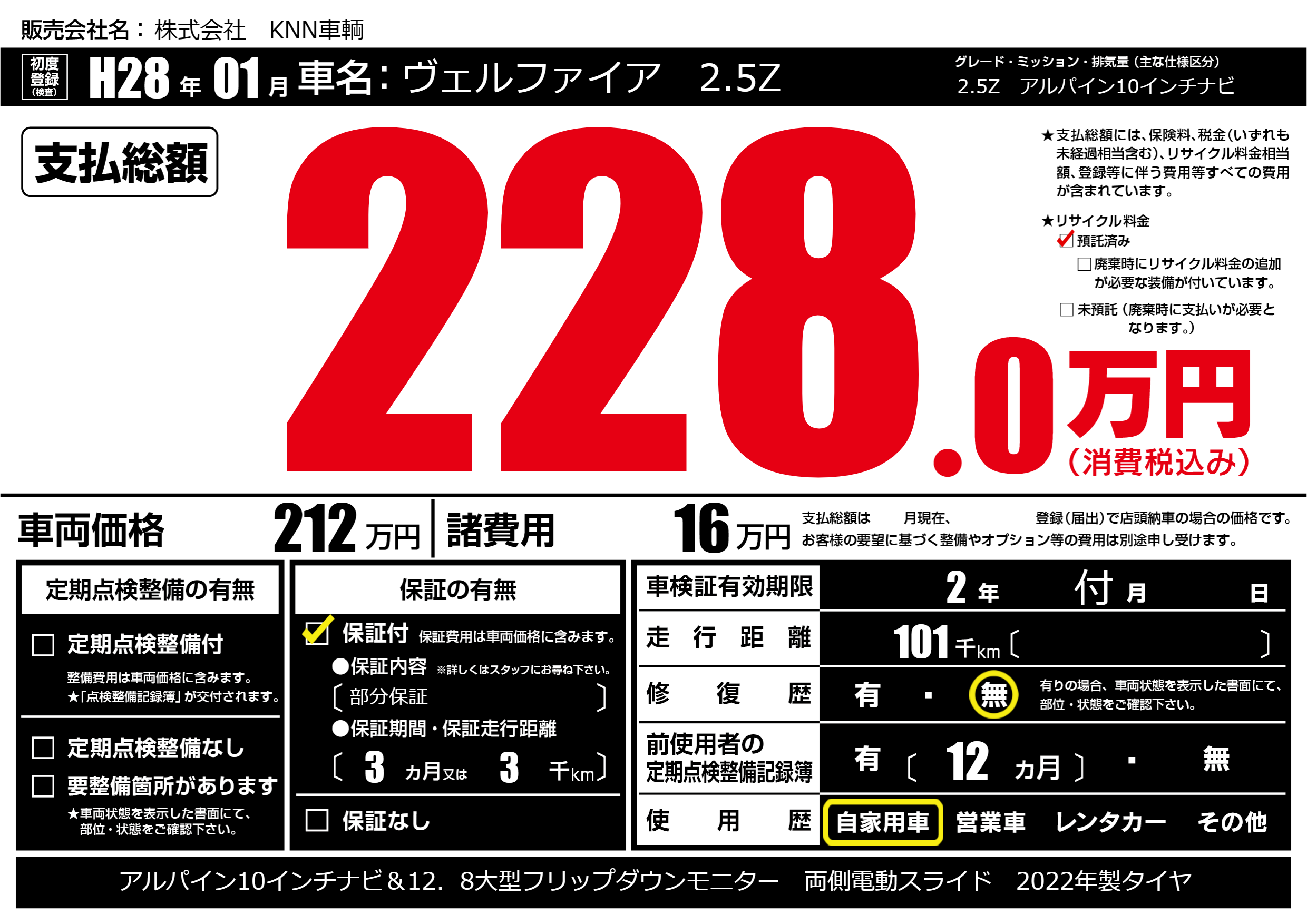 | 車名 | ヴェルファイア 2.5Z | グレード ミッション 排気量 |