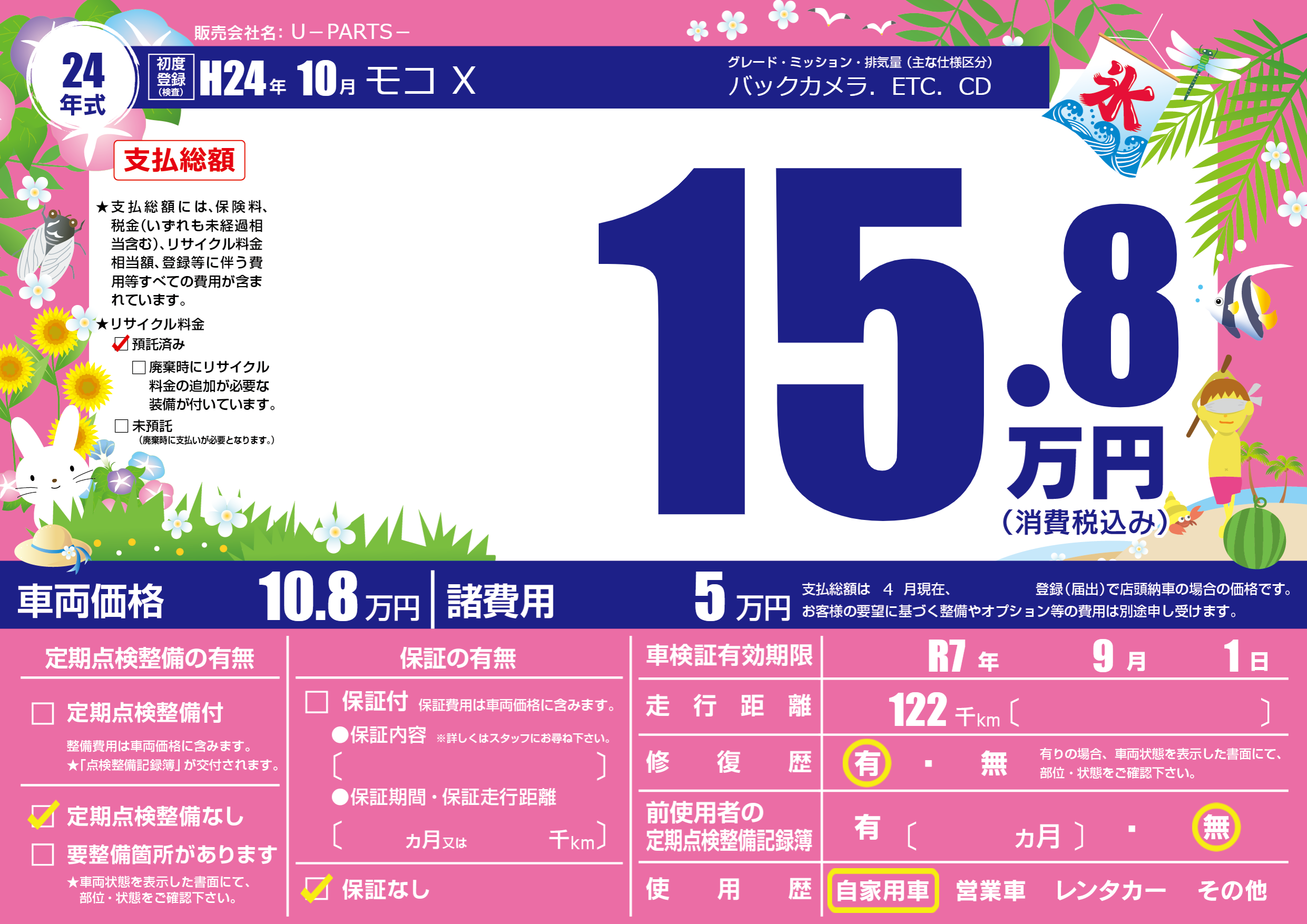 | 車名 | モコ X | グレード ミッション 排気量 |