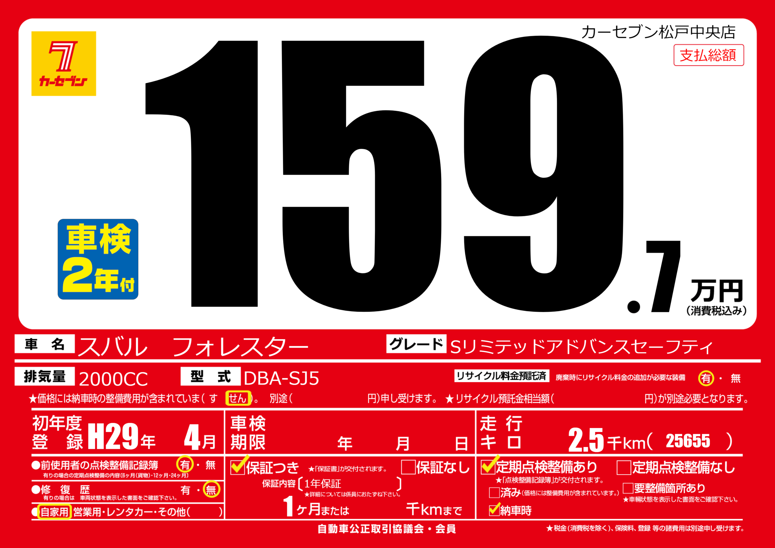 | 車名 | スバル フォレスター | グレード ミッション 排気量 |