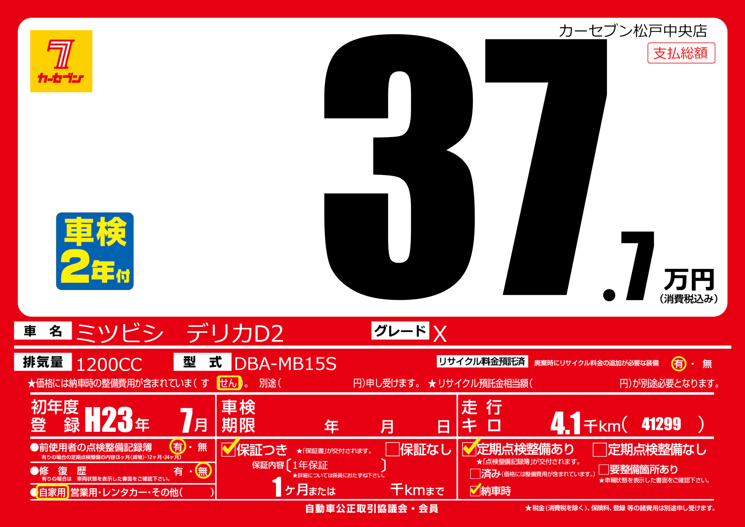 | 走行キロ | 0.4万km | 初年度登録 | H23年7月 |