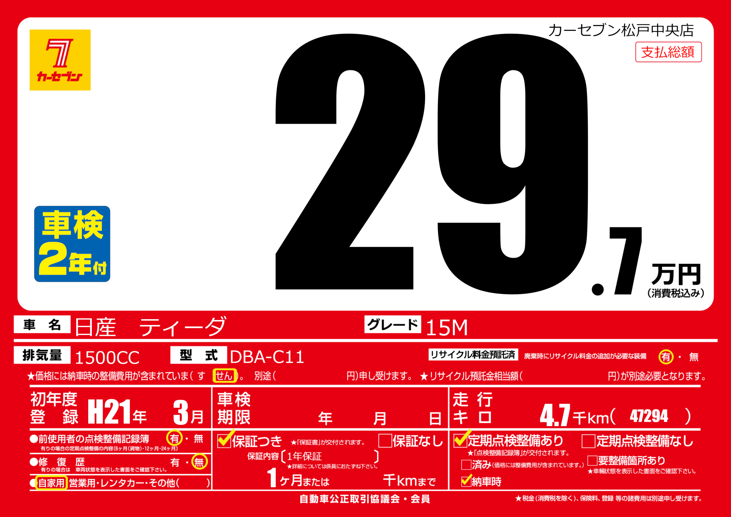 | 車名 | 日産 ティーダ | グレード ミッション 排気量 |