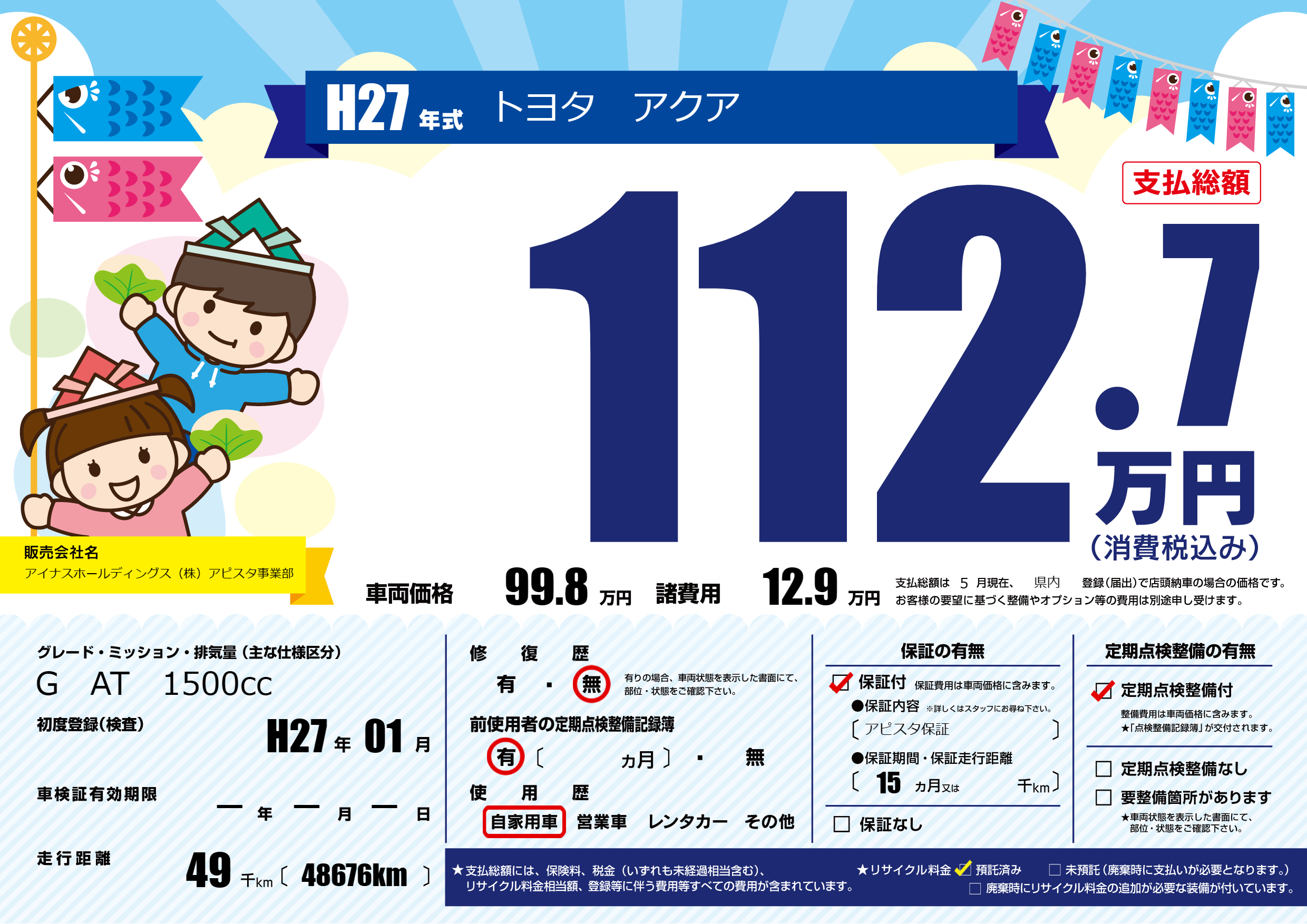 | 車名 | トヨタ アクア | グレード ミッション 排気量 |