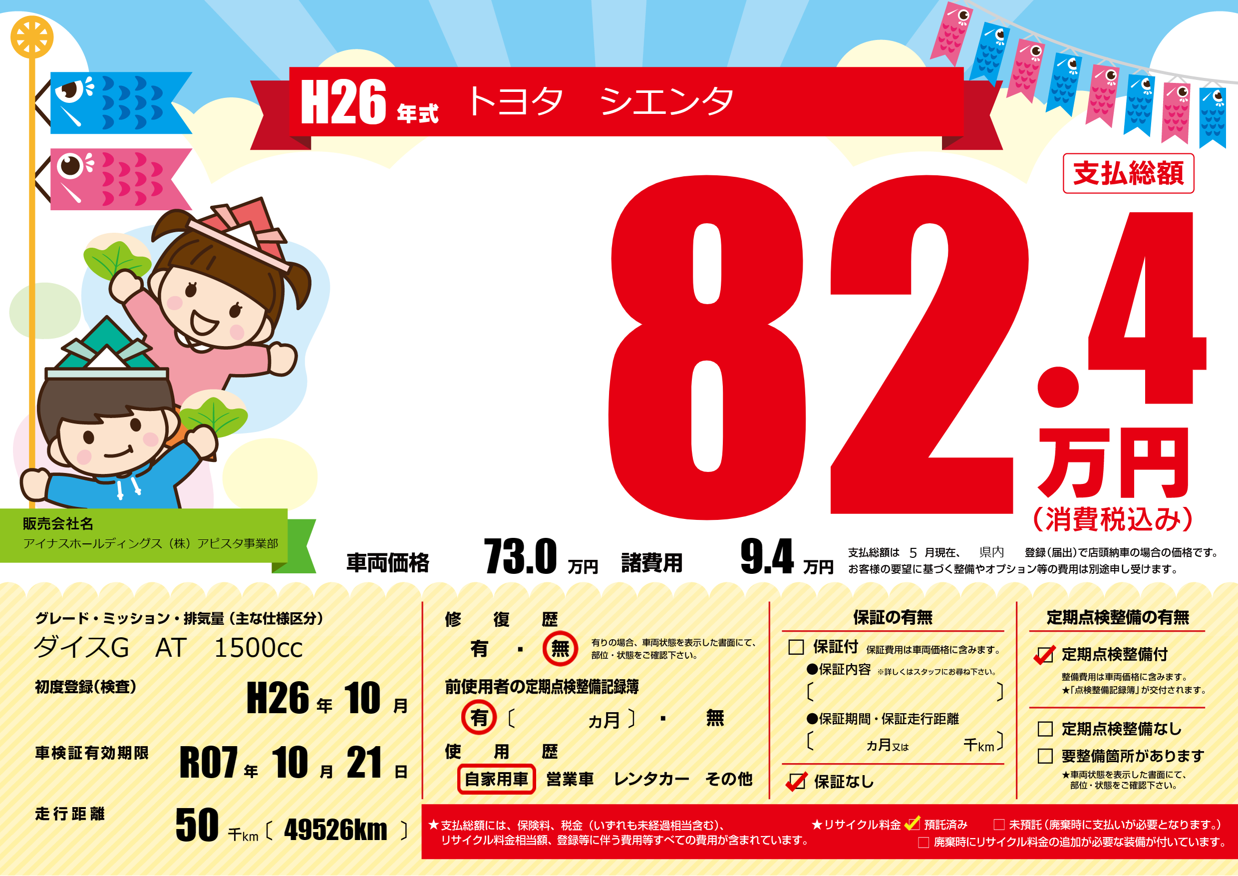| 車名 | トヨタ シエンタ | グレード ミッション 排気量 |