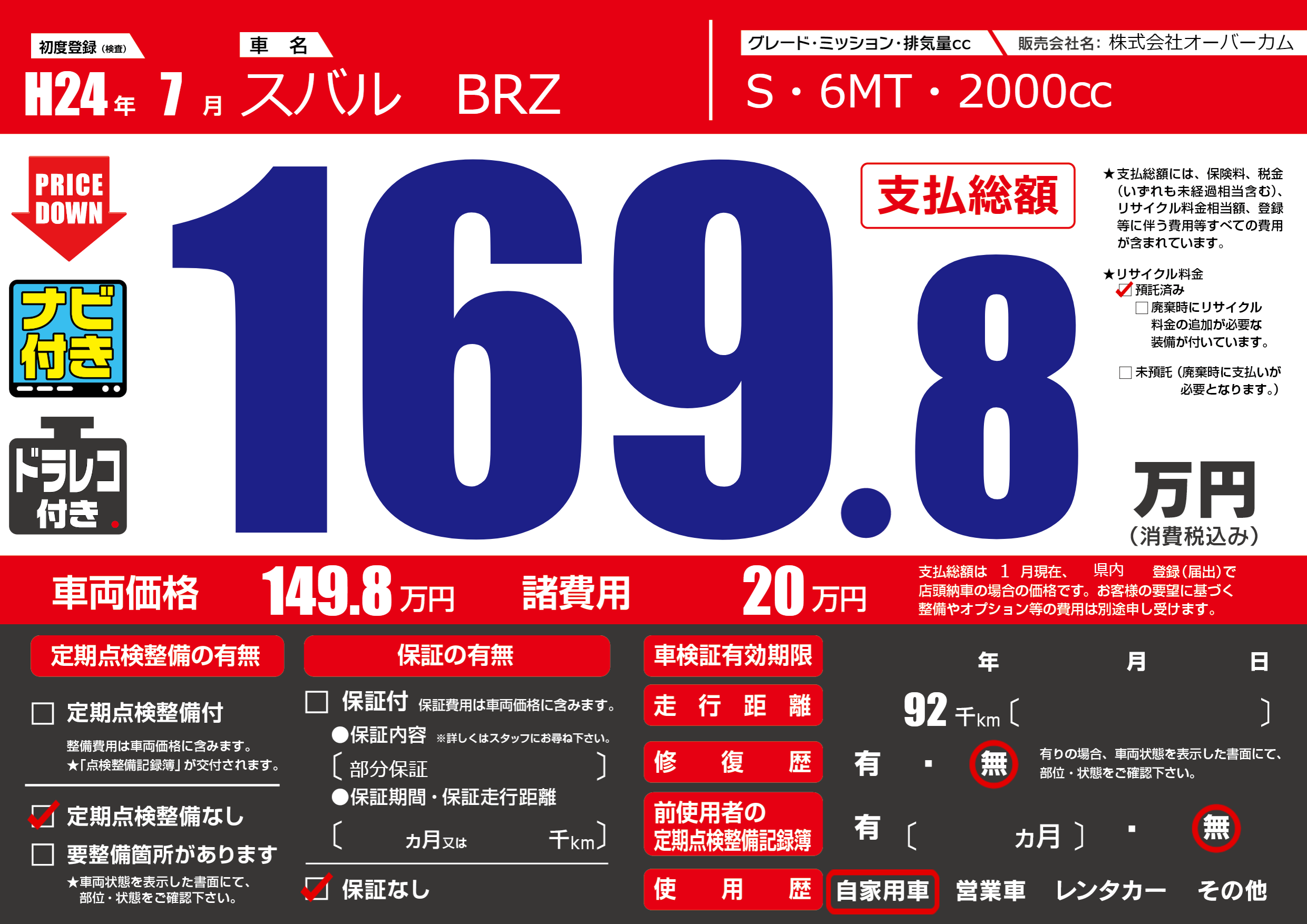 | 車名 | スバル BRZ | グレード ミッション 排気量 |