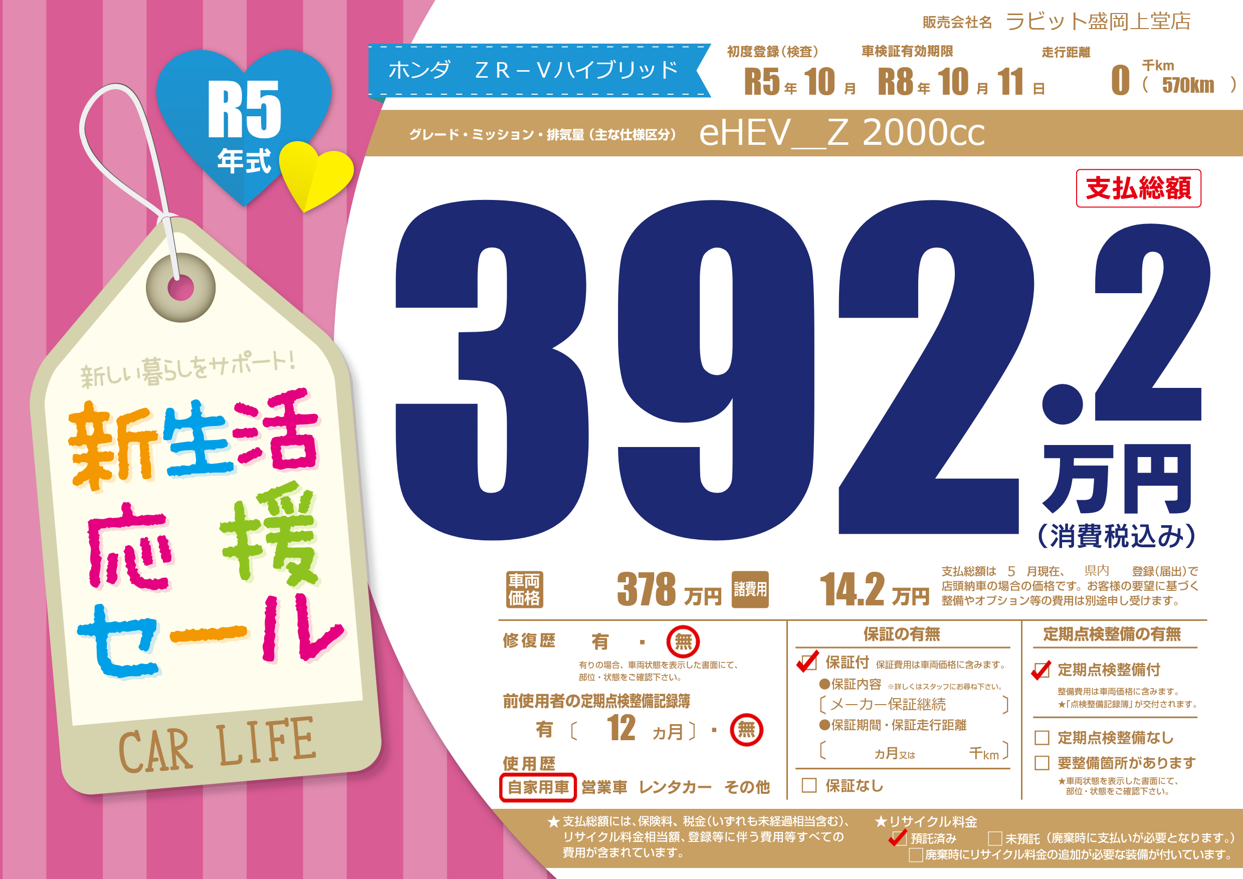| 車名 | ホンダ ZR-Vハイブリッド | グレード ミッション 排気量 |
