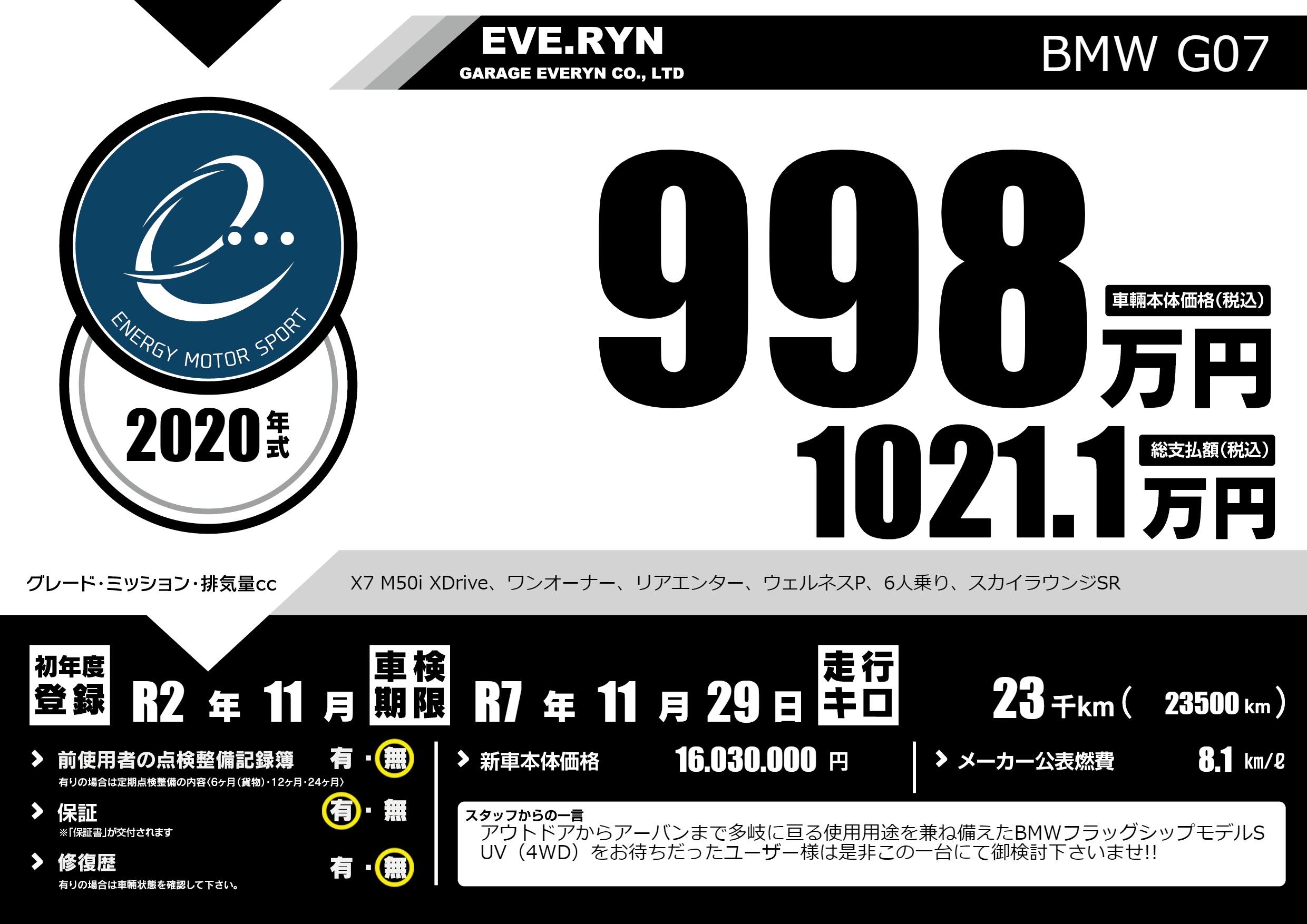 | 車名 | BMW G07 | グレード ミッション 排気量 |