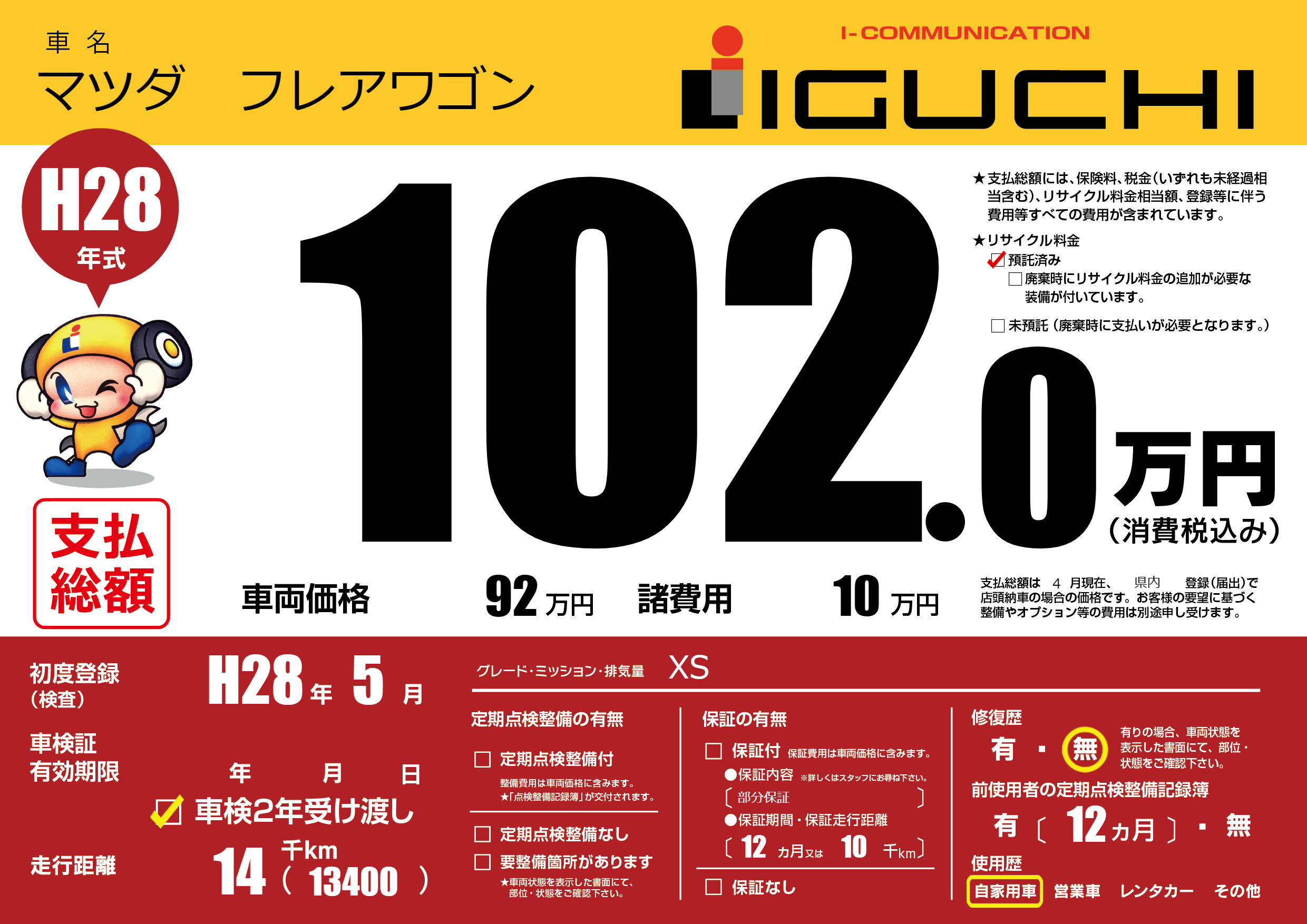 | 車名 | マツダ フレアワゴン | グレード ミッション 排気量 |