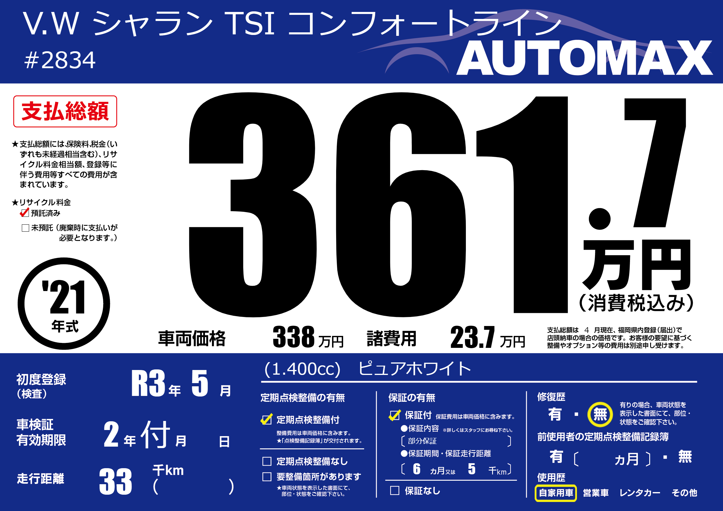 | 車名 | V.W シャラン TSI コンフォートライン | グレード ミッション 排気量 |