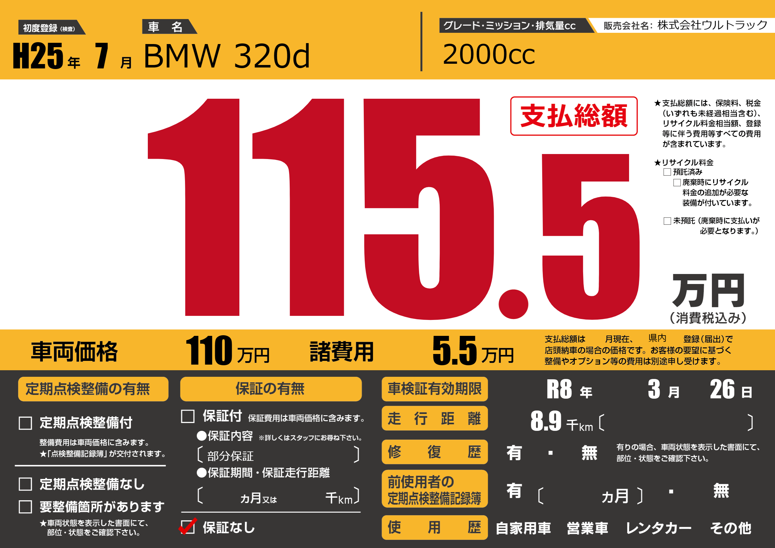 | 車名 | BMW 320d | グレード ミッション 排気量 |