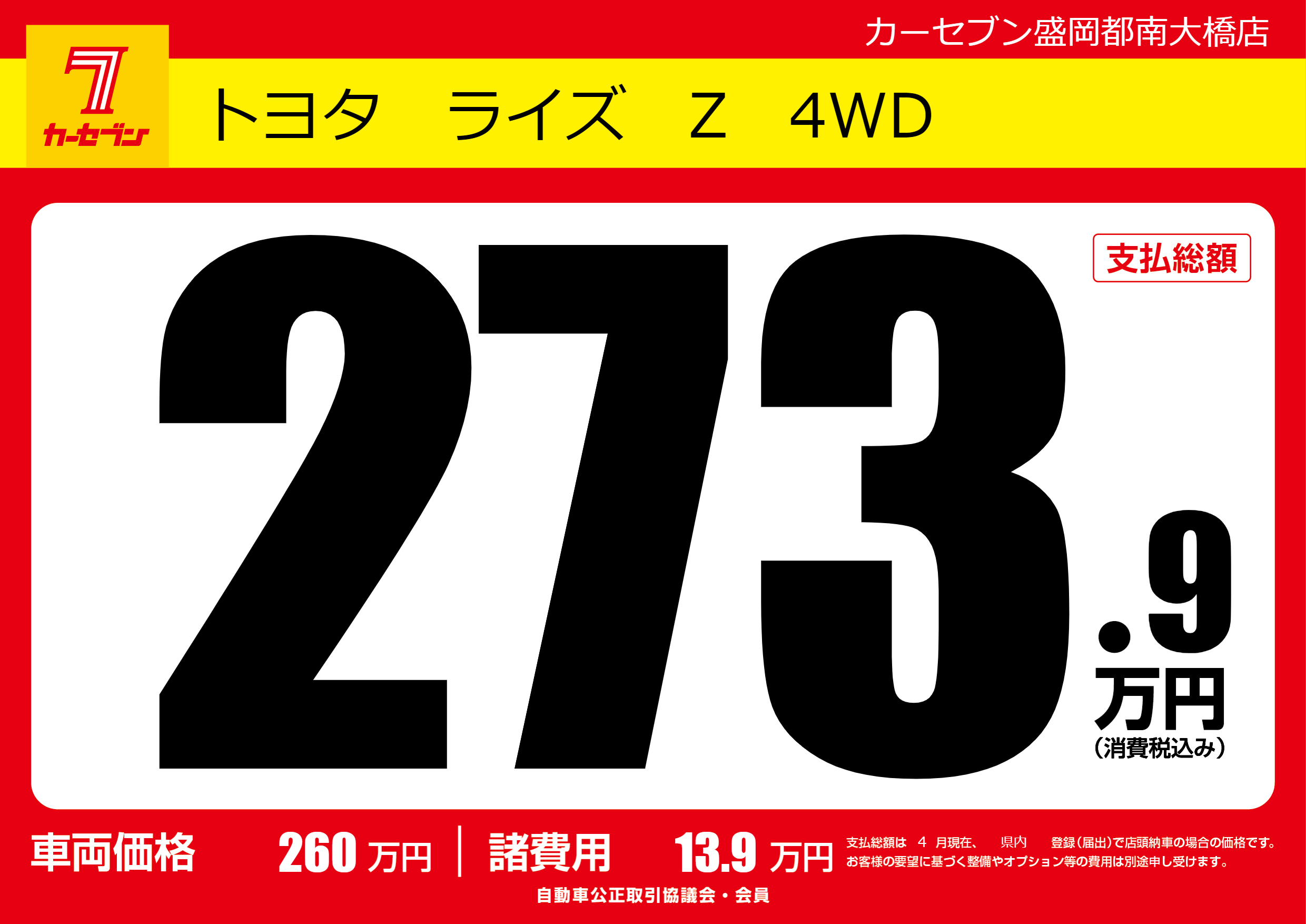 | 車名 | トヨタ ライズ Z 4WD | グレード ミッション 排気量 |
