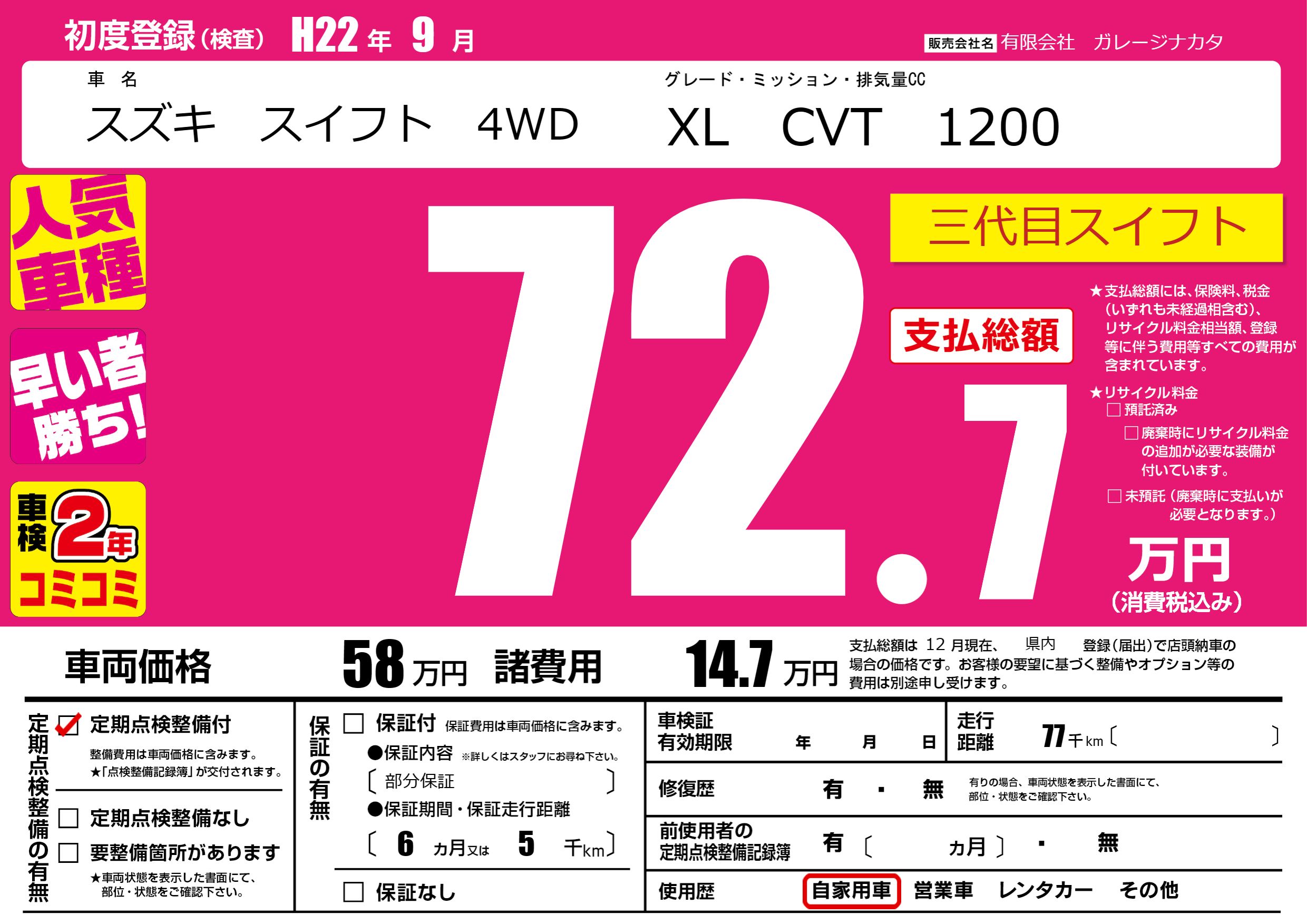 | 走行キロ | 7.7万km | 初年度登録 | H22年9月 |
