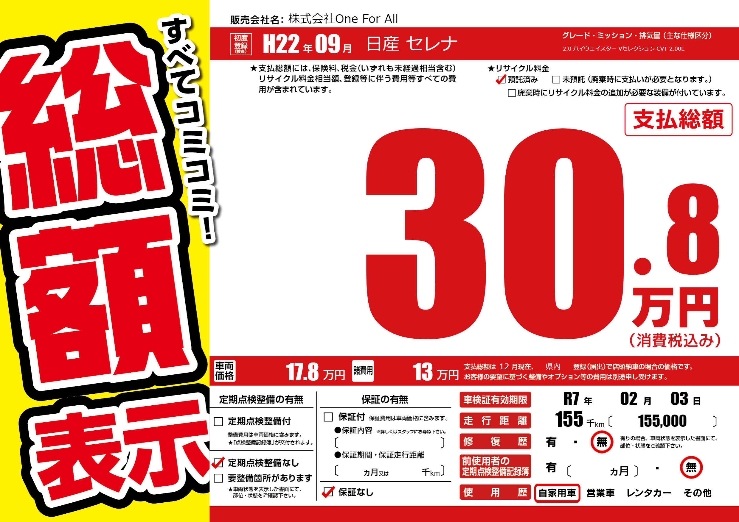 | 車検制限 | R7年 02月 03日 | ||