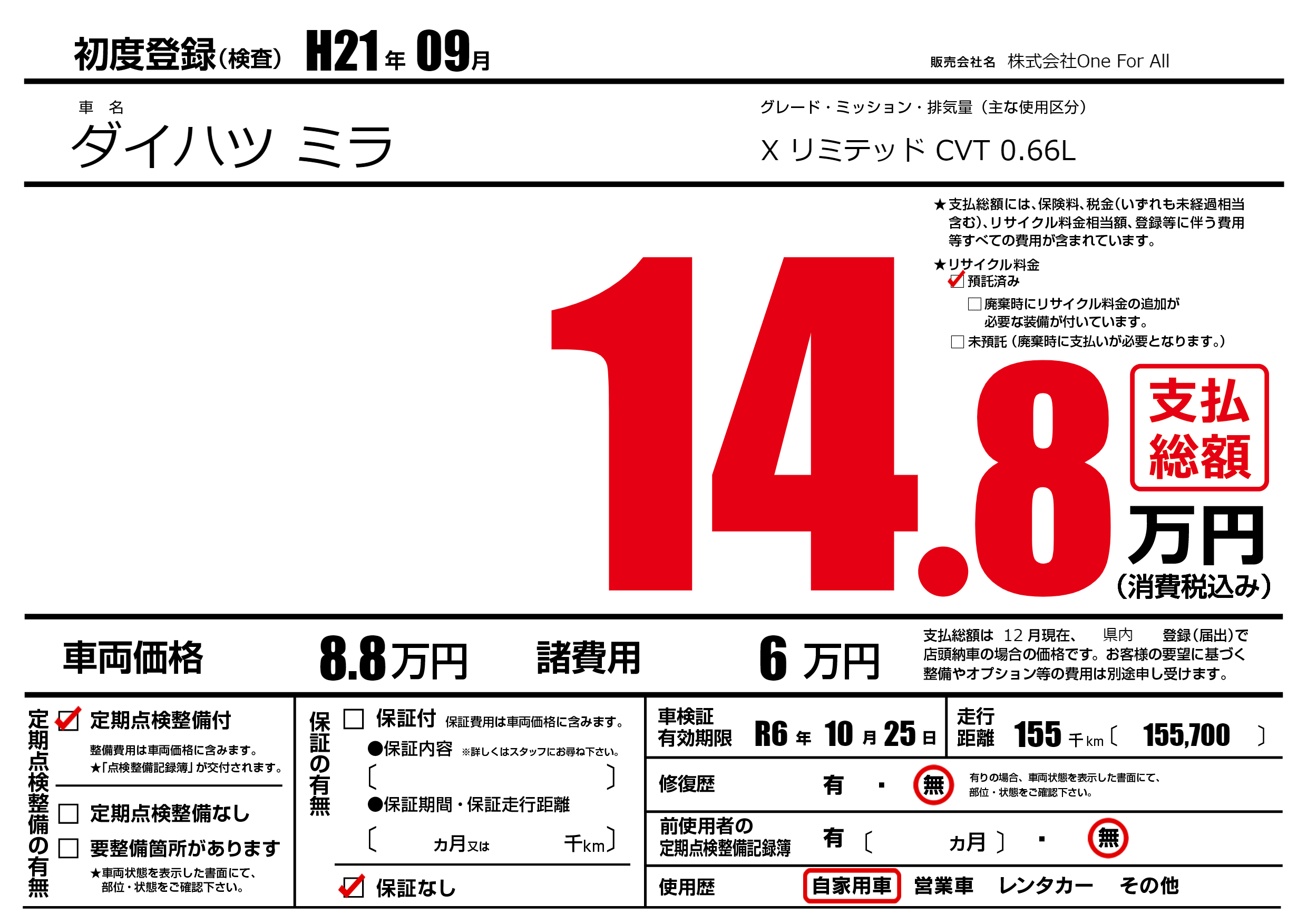 | 走行キロ | 15.5万km | 初年度登録 | H21年09月 |