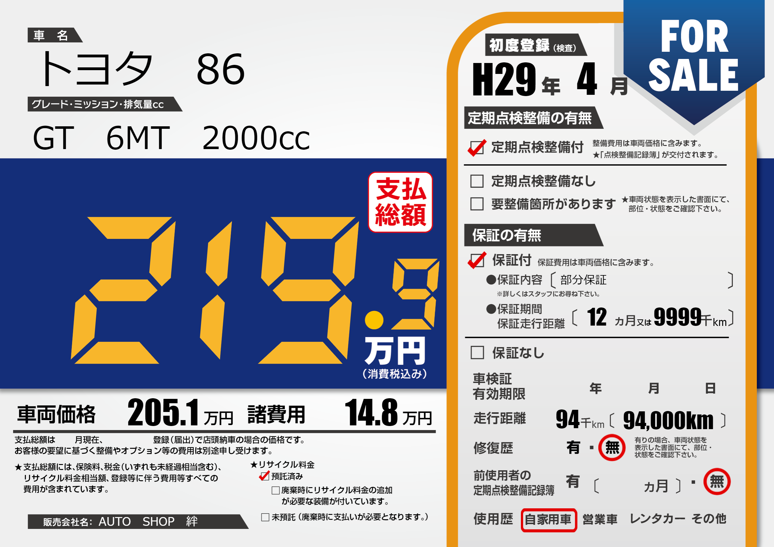 保証付き 保証内容(部分保証) 12ヶ月または(9999)千kmまで |