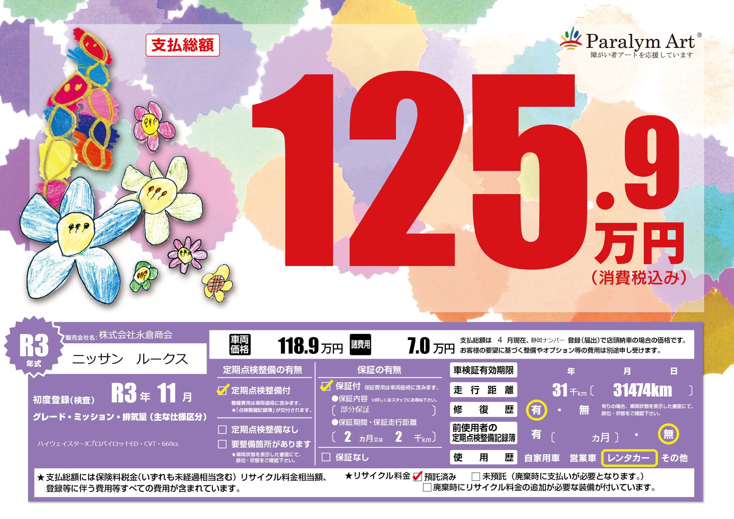 | 車名 | ニッサン ルークス | グレード ミッション 排気量 |