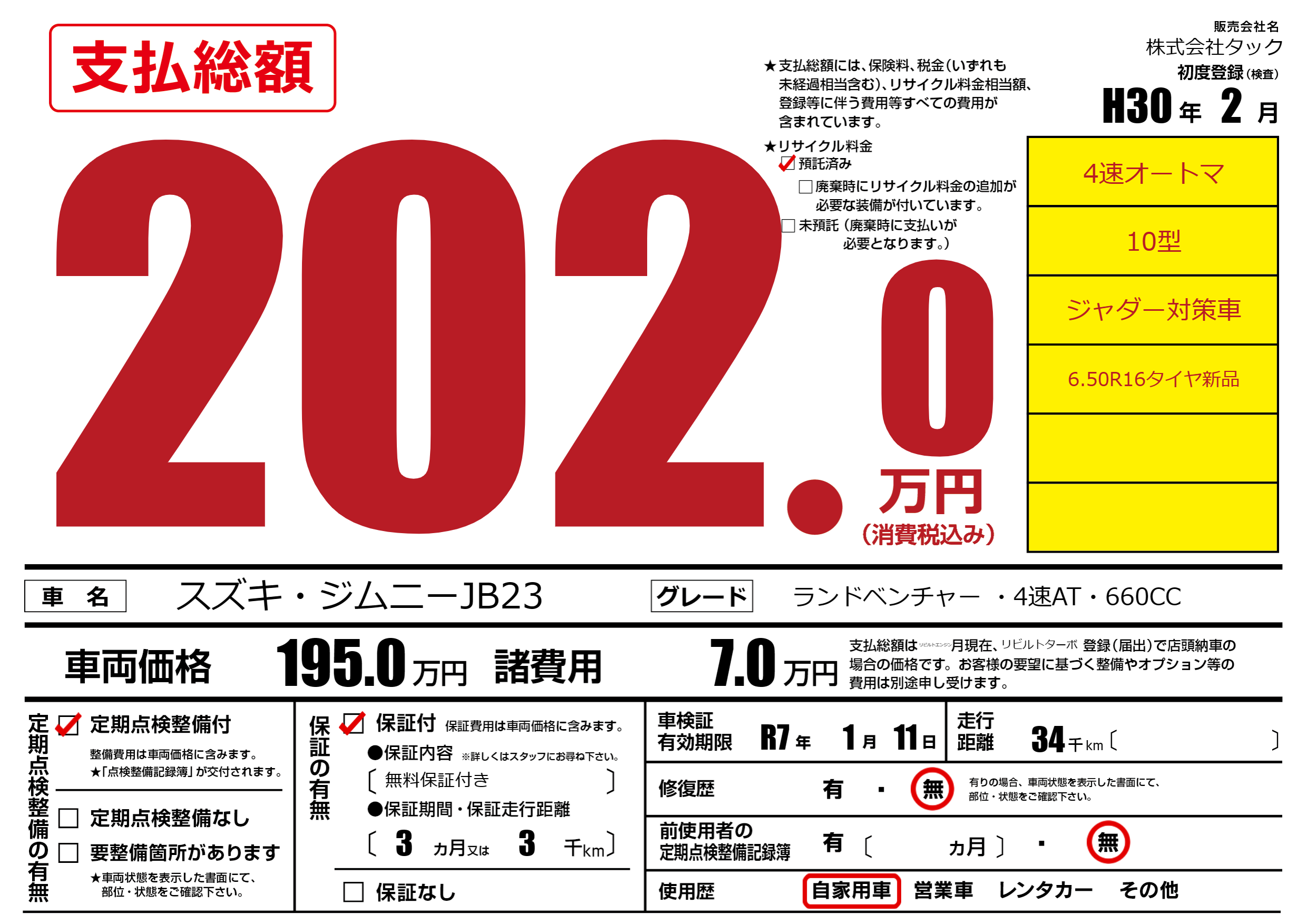 | 車名 | スズキ・ジムニーJB23 | グレード ミッション 排気量 |