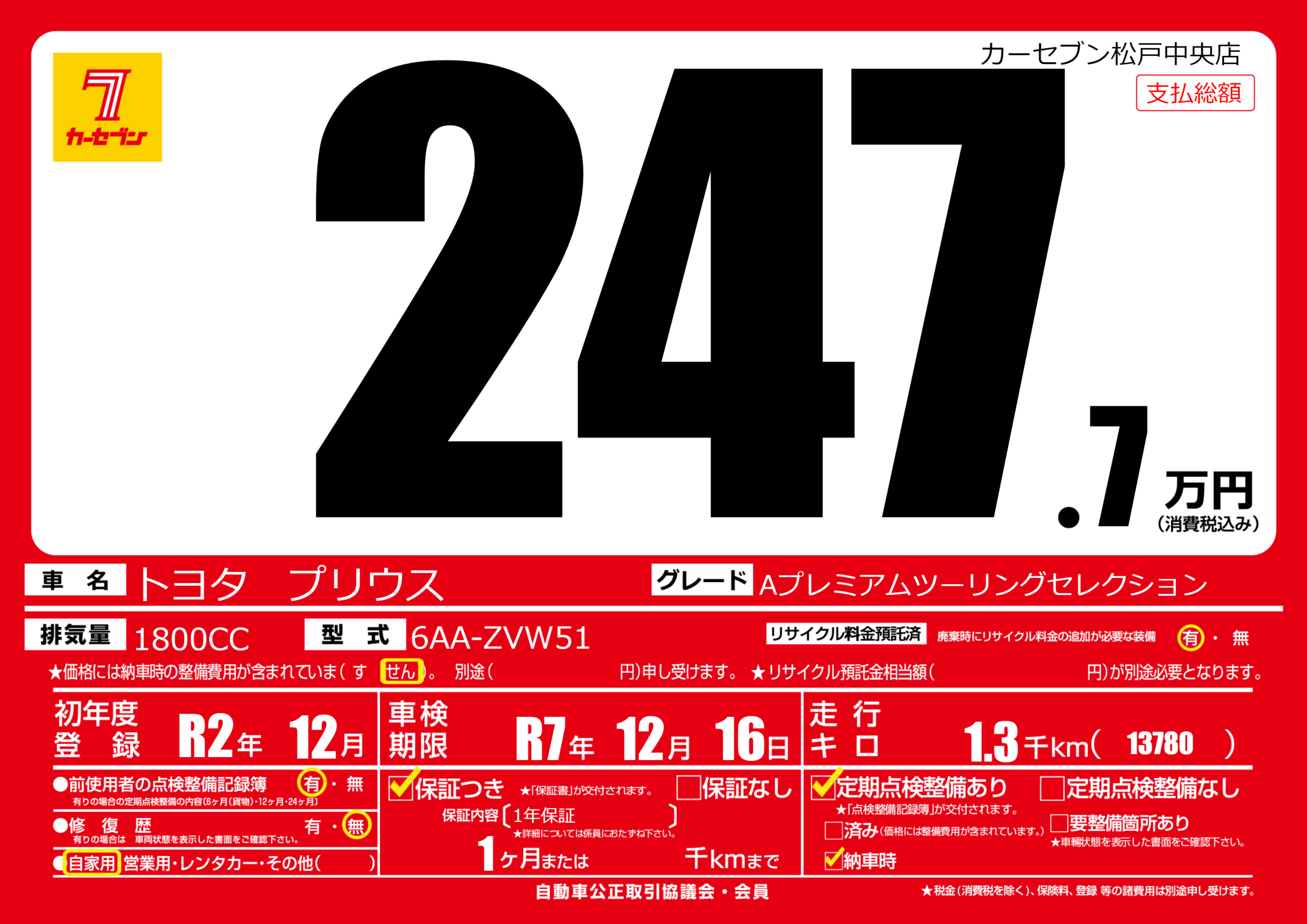 | 車名 | トヨタ プリウス | グレード ミッション 排気量 |