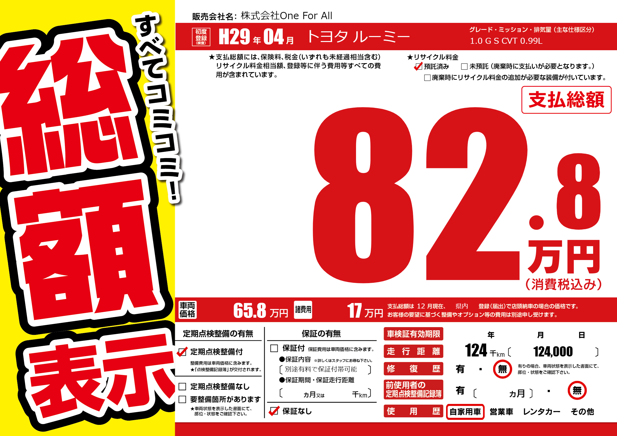 | 走行キロ | 12.4万km | 初年度登録 | H29年04月 |