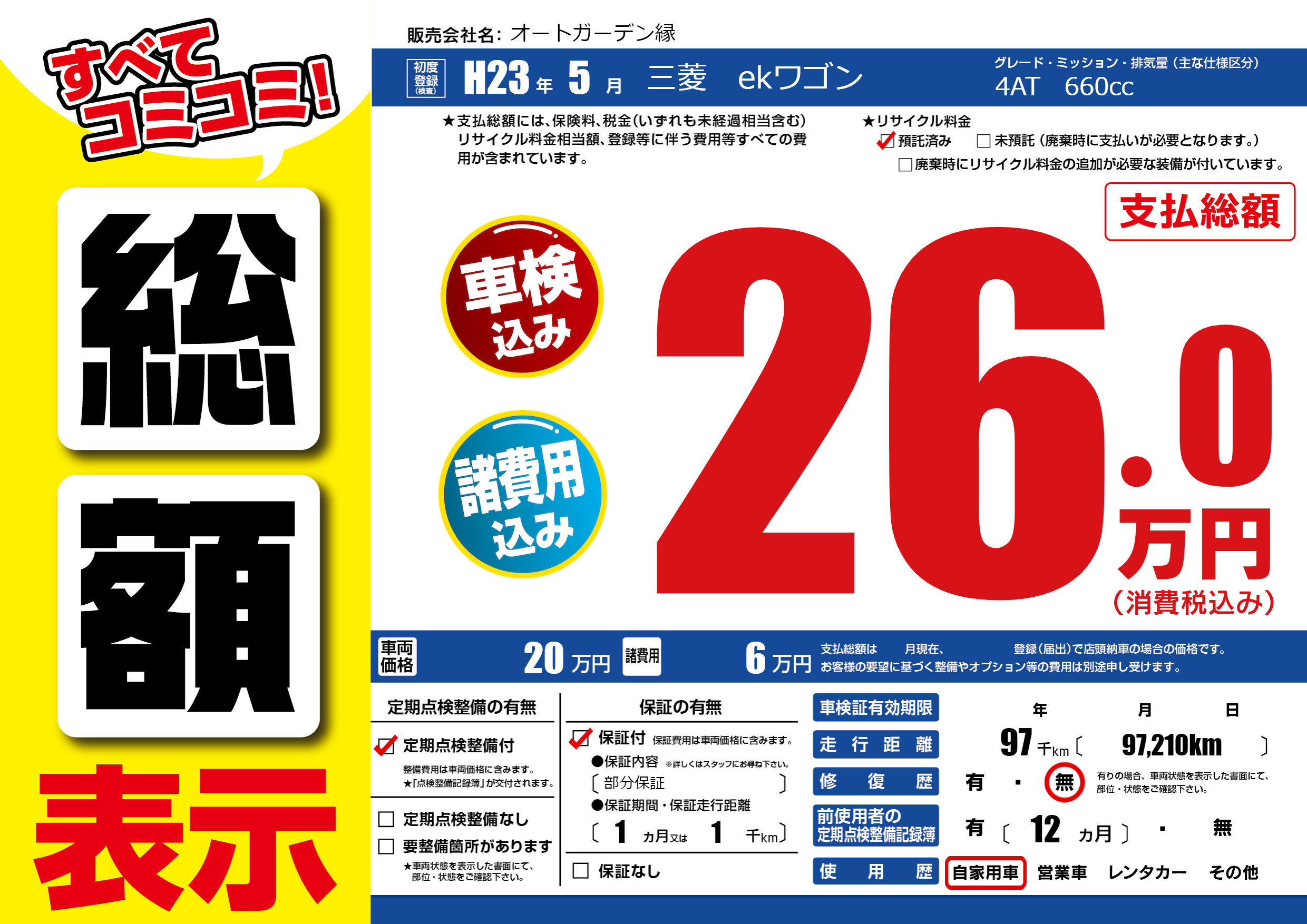 | 走行キロ | 9.7万km | 初年度登録 | H23年5月 |