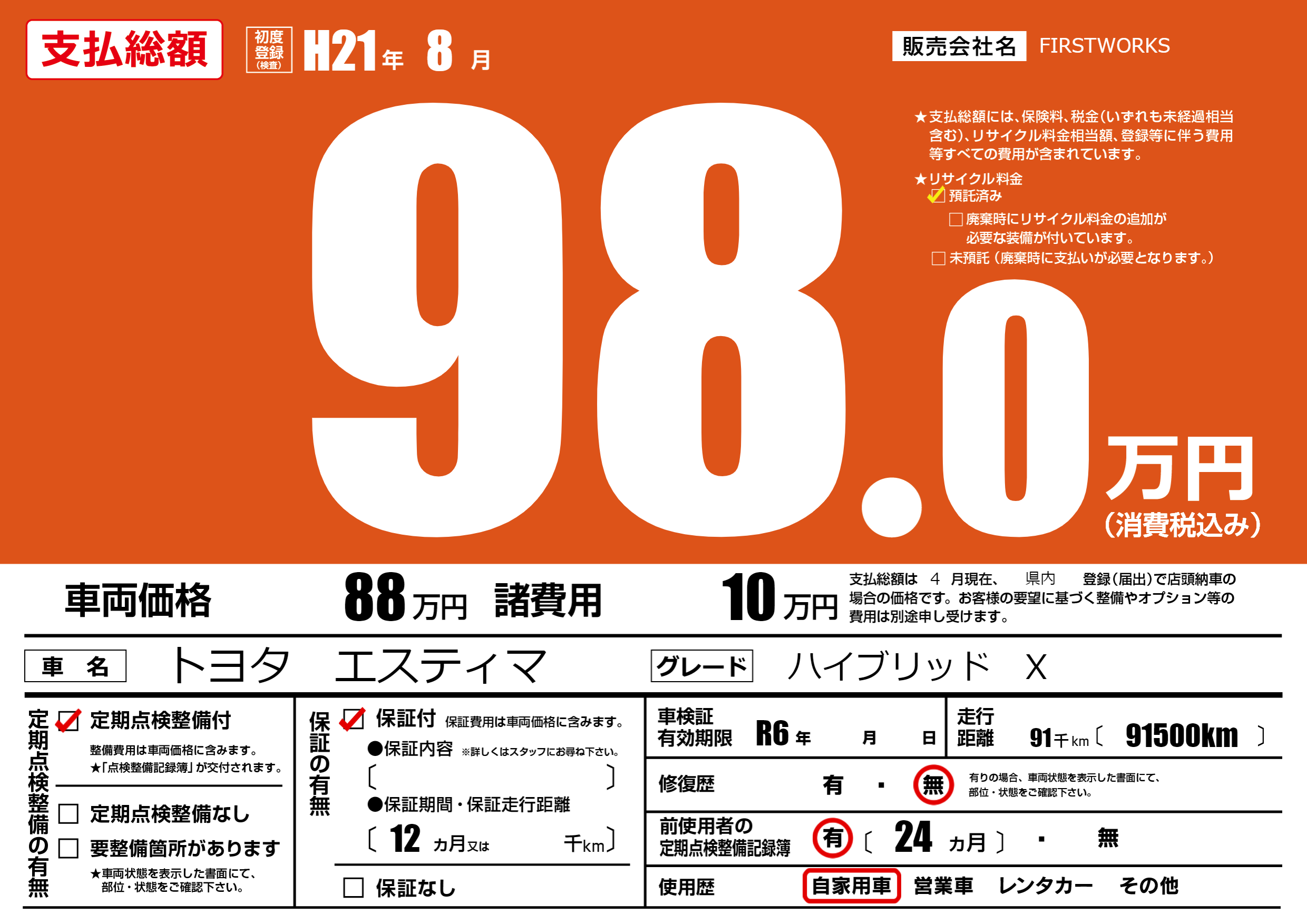| 走行キロ | 9.1万km | 初年度登録 | H21年8月 |