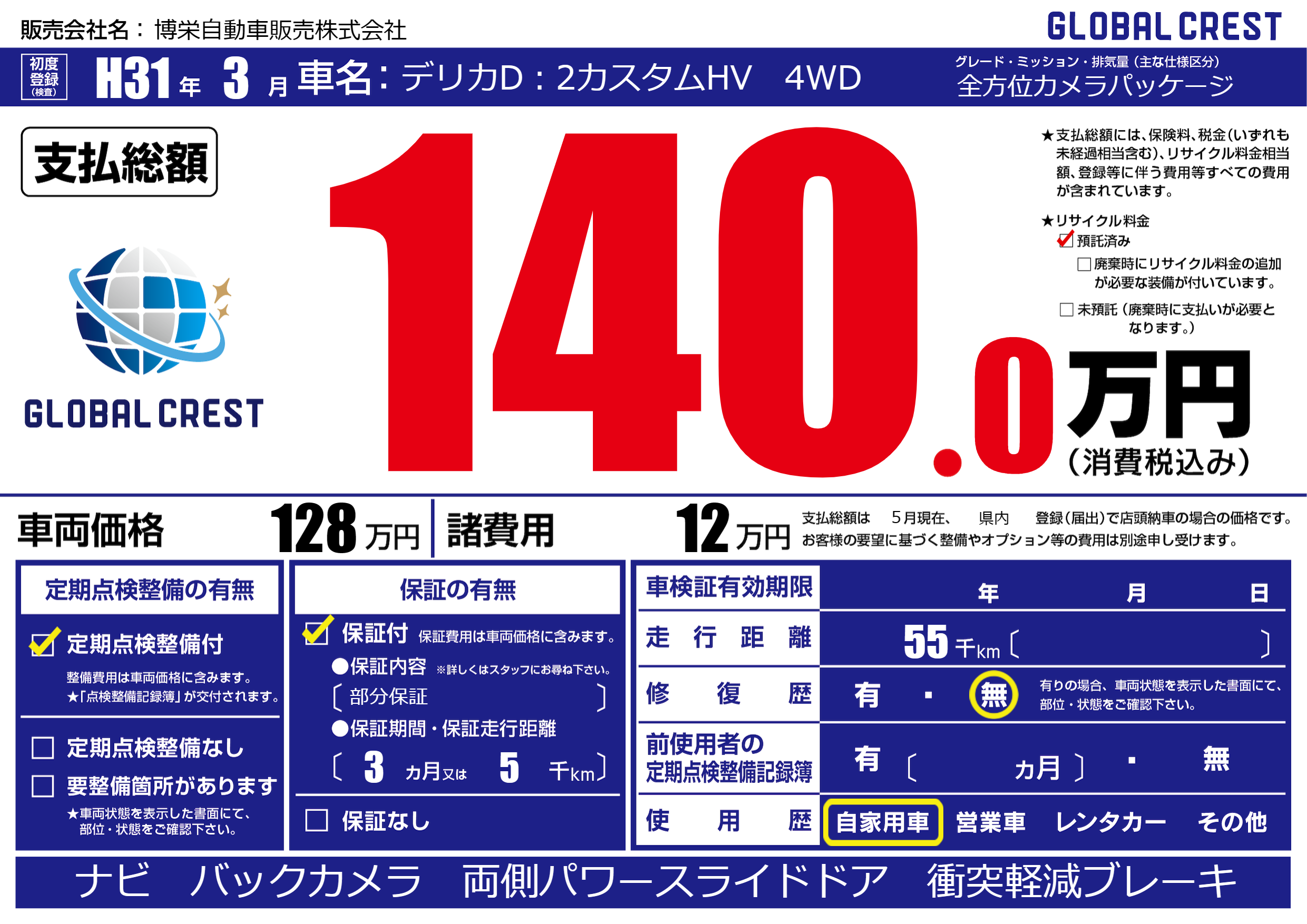 | 走行キロ | 5.5万km | 初年度登録 | H31年3月 |