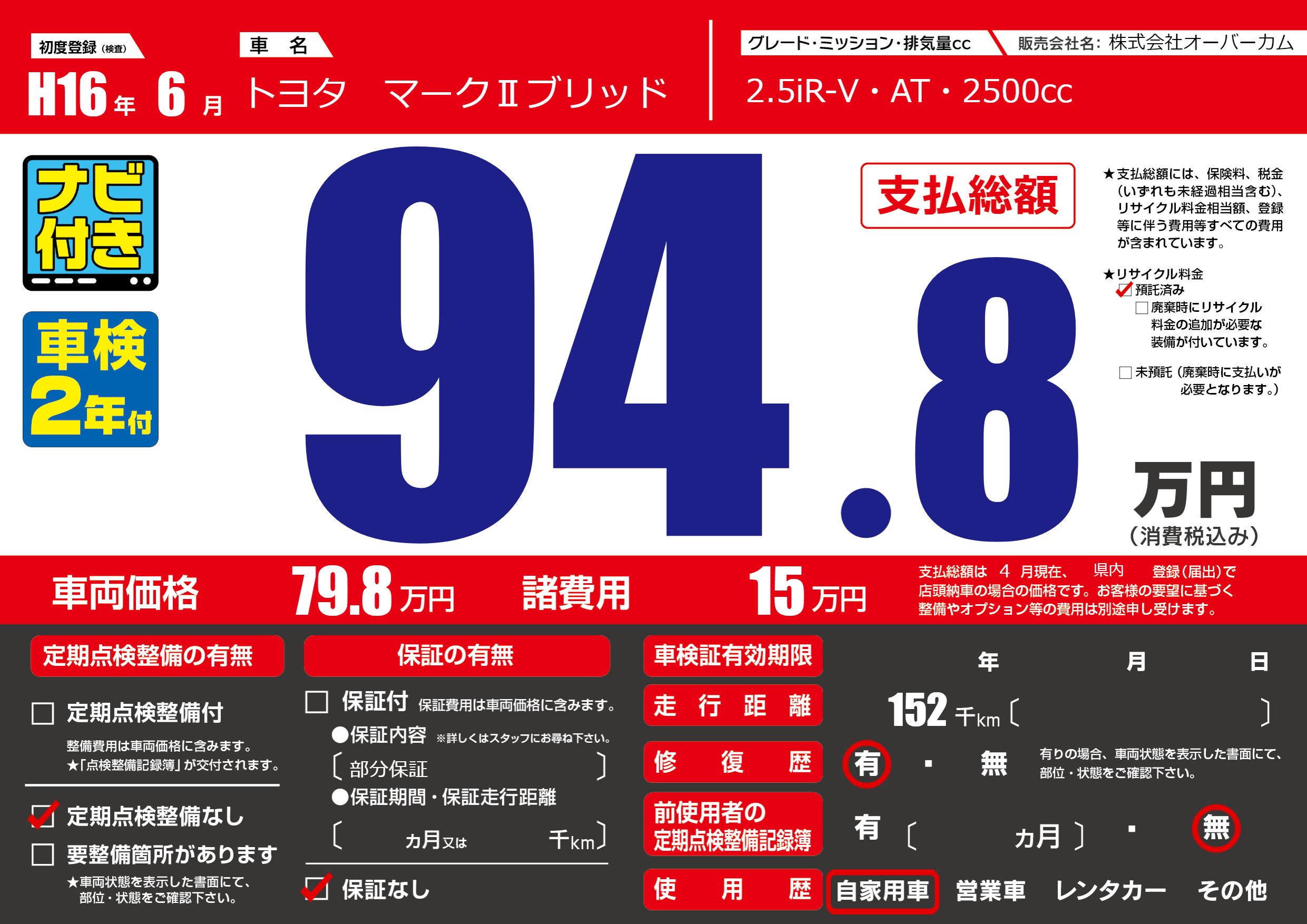| 走行キロ | 15.2万km | 初年度登録 | H16年6月 |