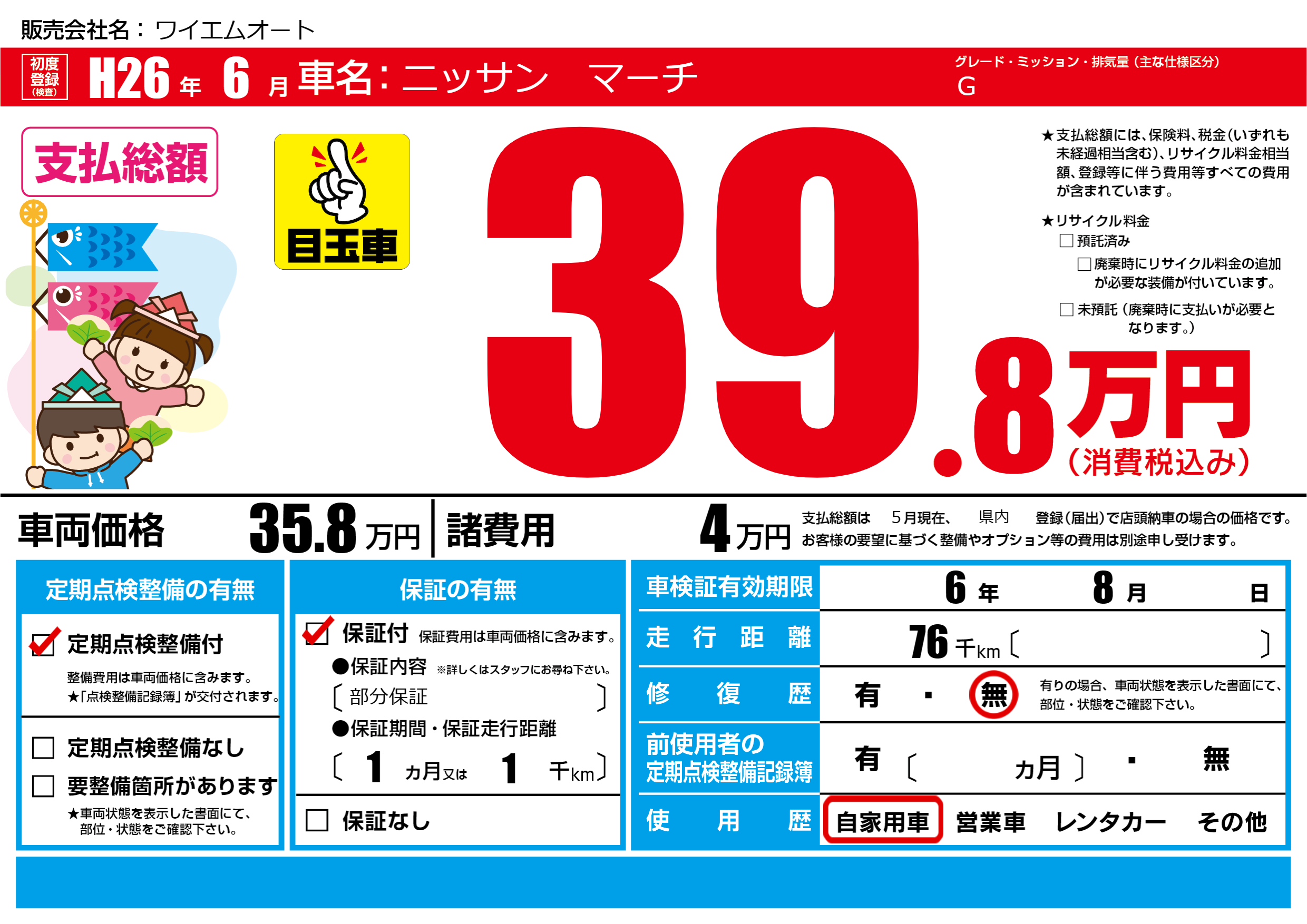 | 車名 | ニッサン マーチ | グレード ミッション 排気量 |
