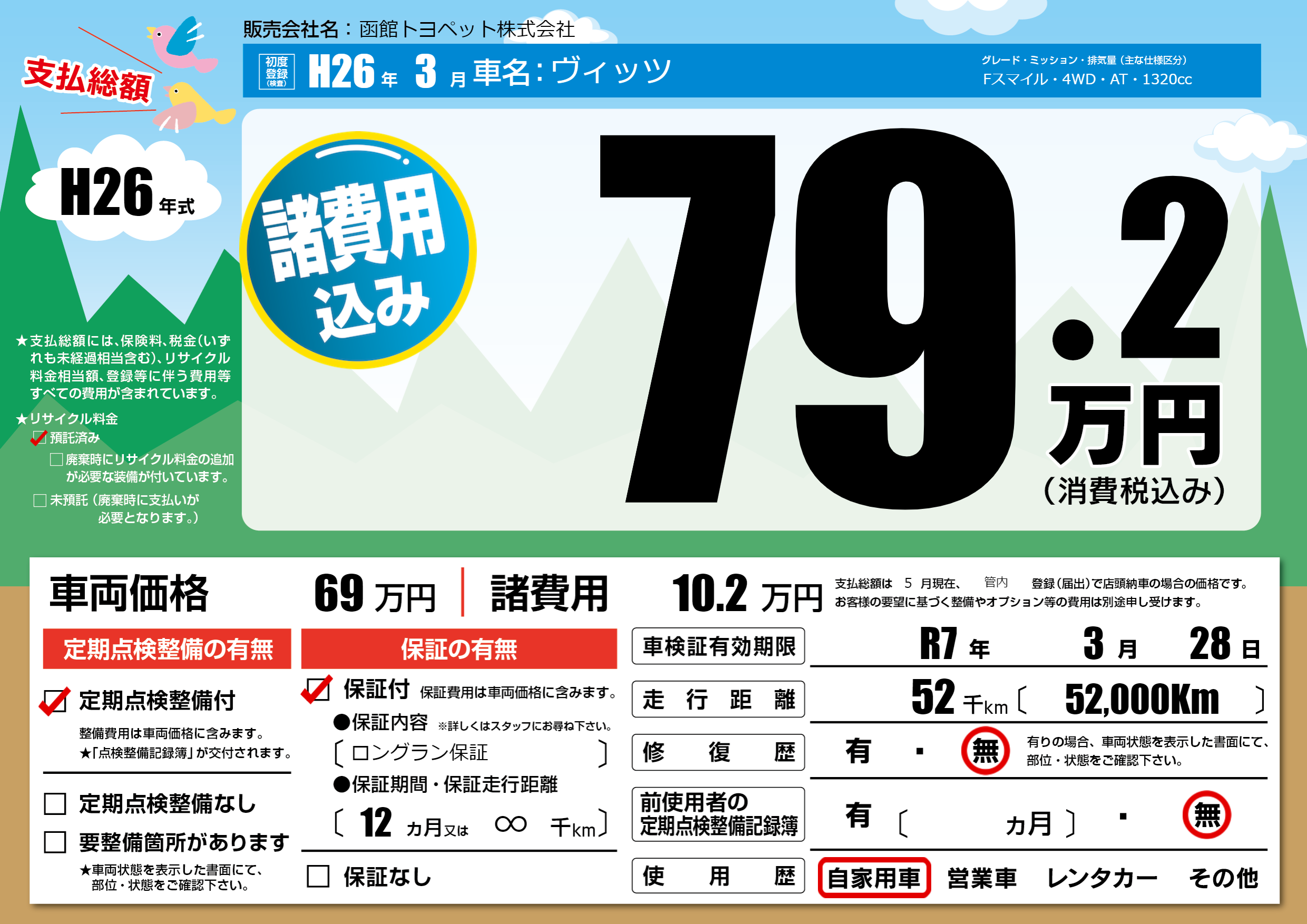 | 走行キロ | 5.2万km | 初年度登録 | H26年3月 |