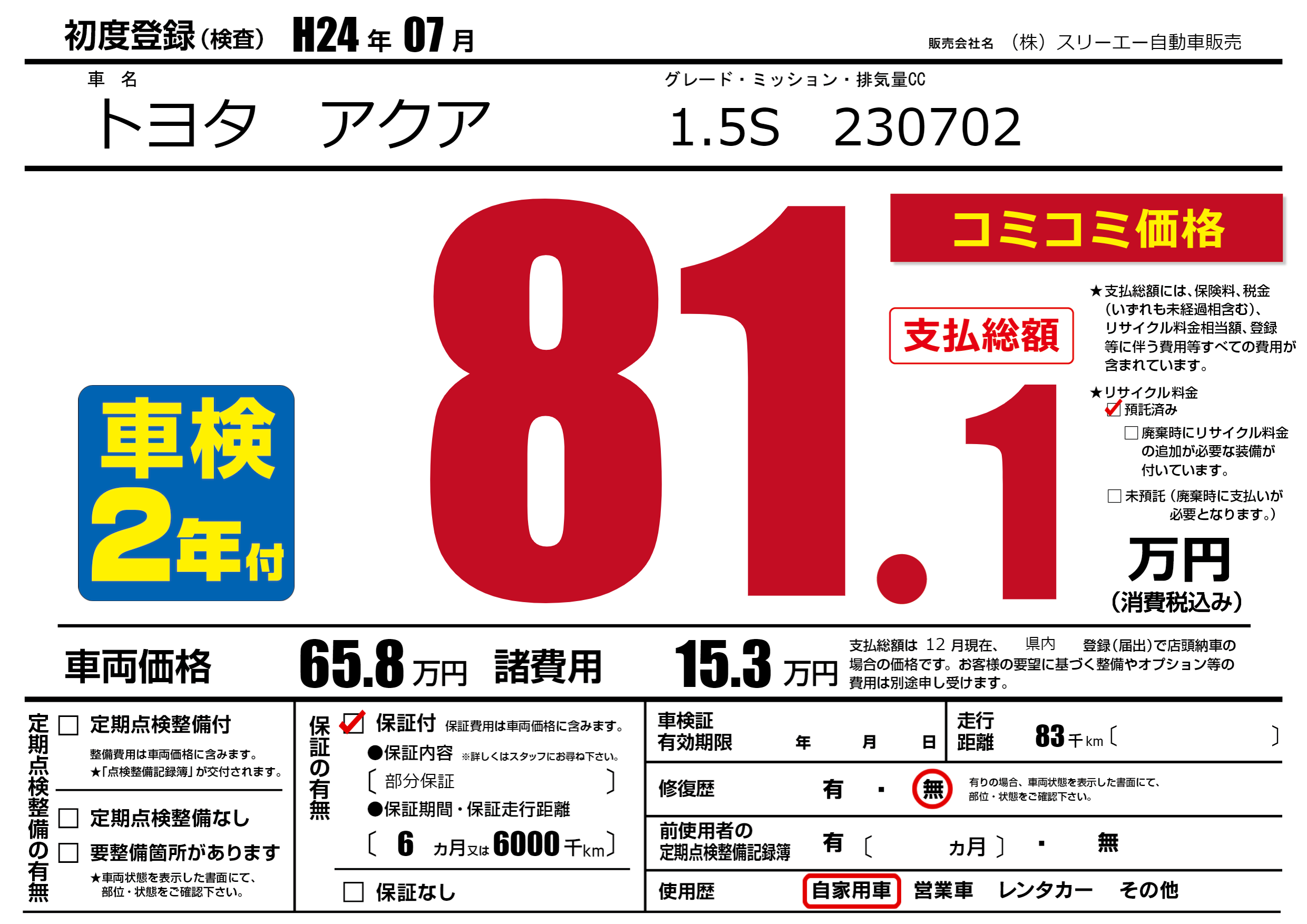 | 走行キロ | 8.3万km | 初年度登録 | H24年07月 |
