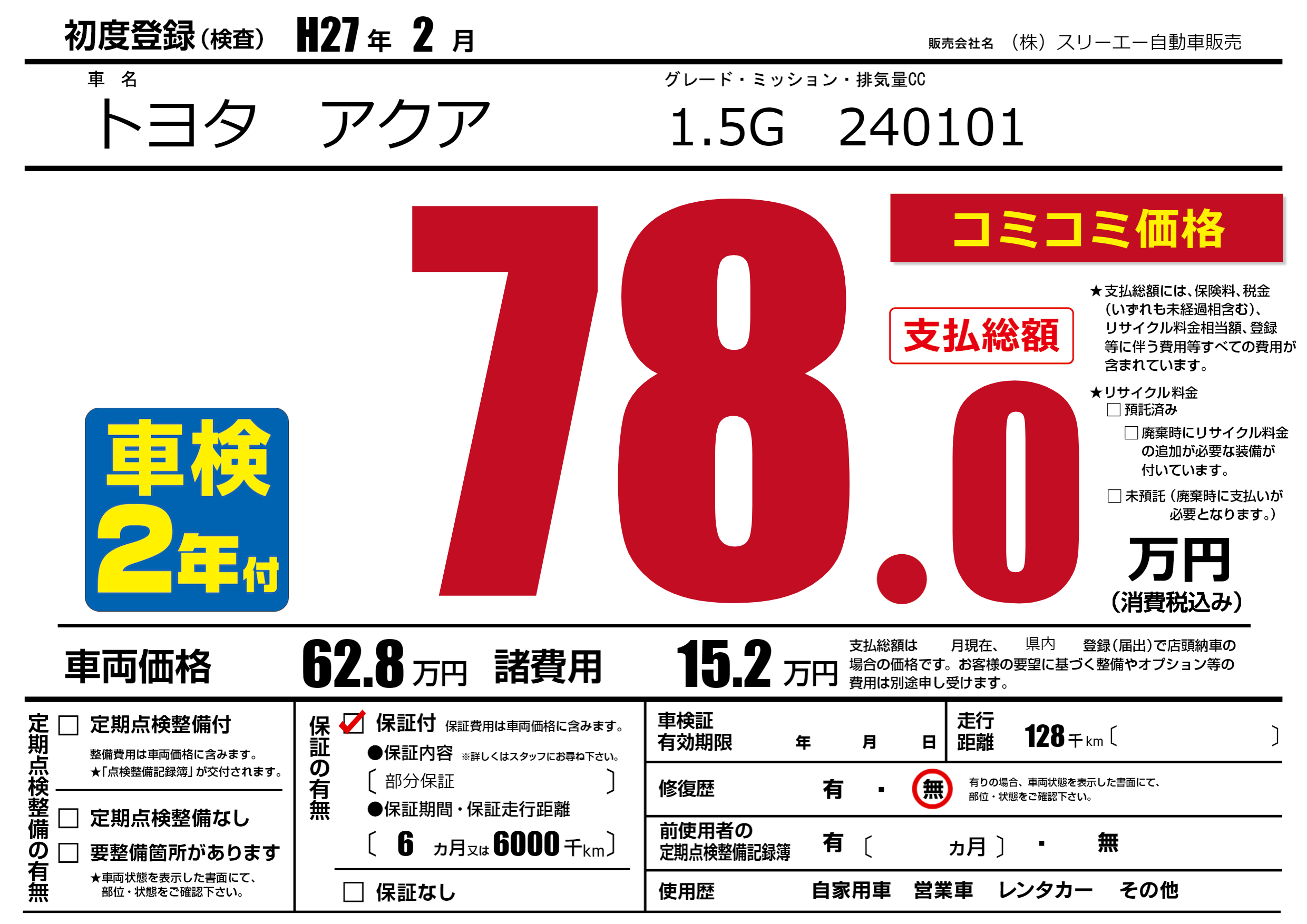 保証付き 保証内容(部分保証) 6ヶ月または(6000)千kmまで |