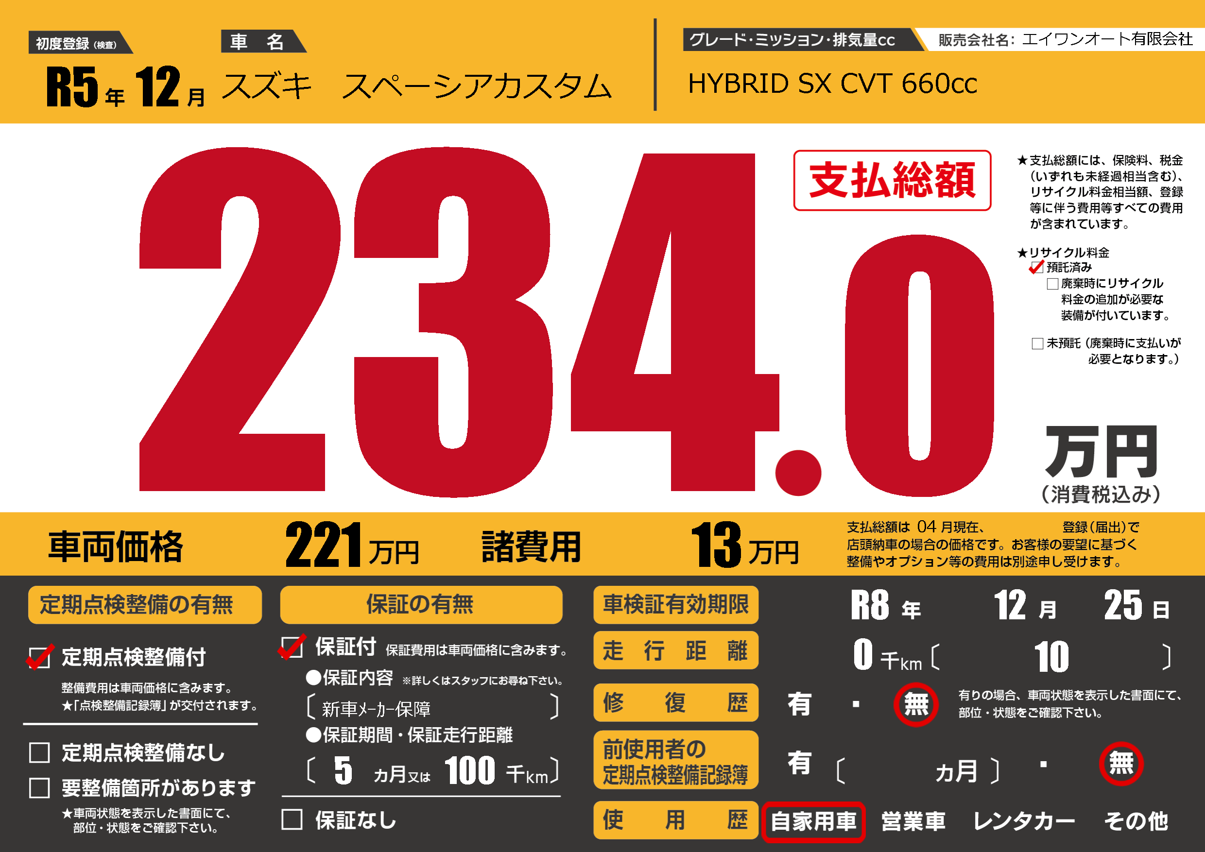 | 車検制限 | R8年 12月 25日 | ||