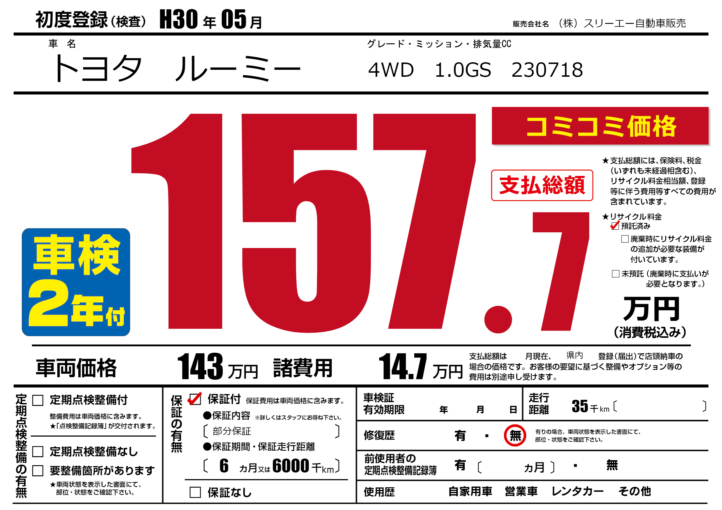| 車名 | トヨタ ルーミー | グレード ミッション 排気量 |