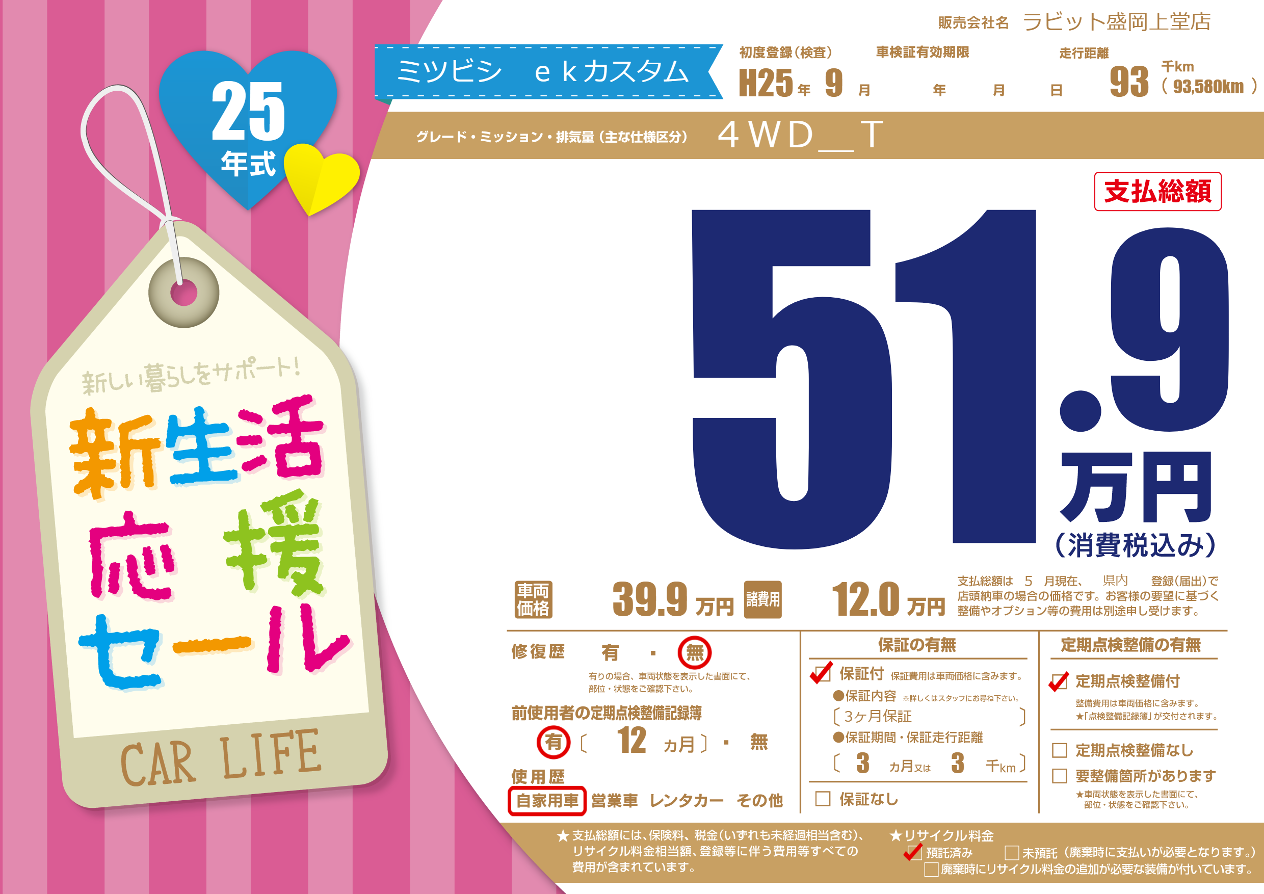 | 走行キロ | 9.3万km | 初年度登録 | H25年9月 |