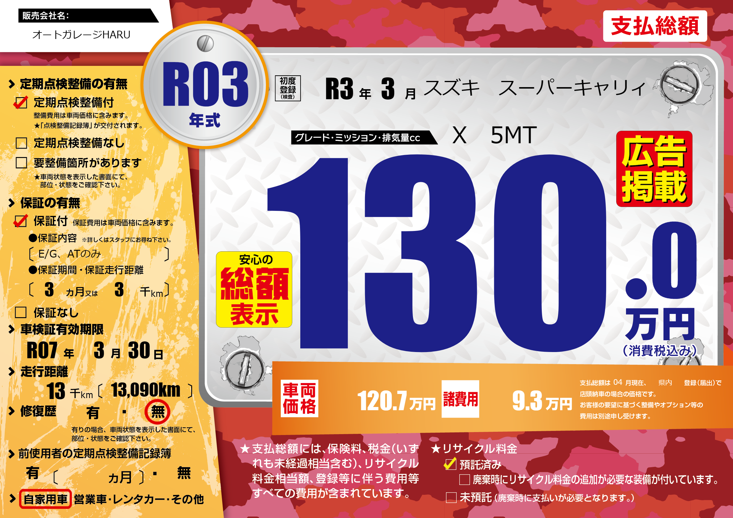 | 走行キロ | 1.3万km | 初年度登録 | R3年3月 |