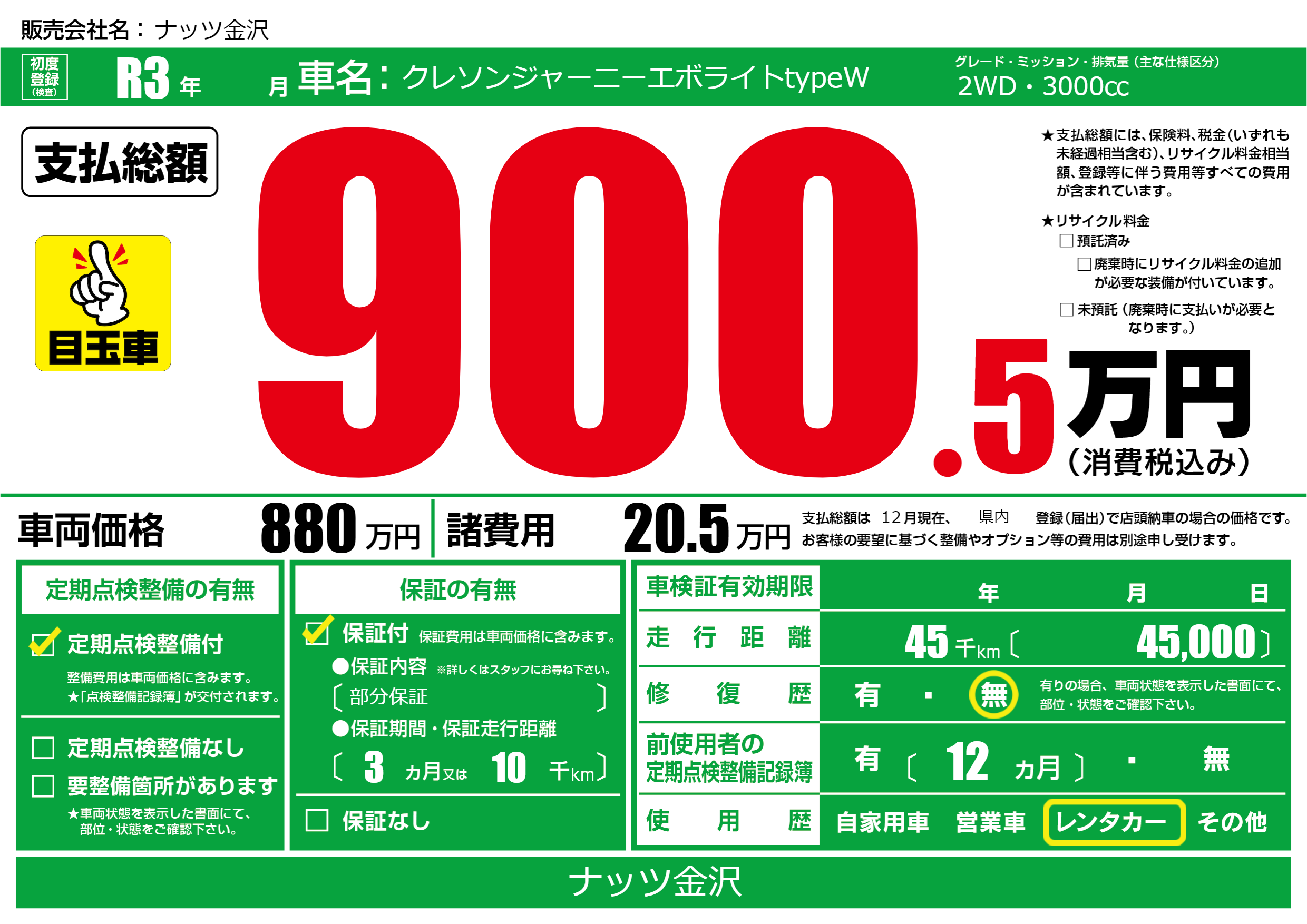 保証付き 保証内容(部分保証) 3ヶ月または(10)千kmまで |