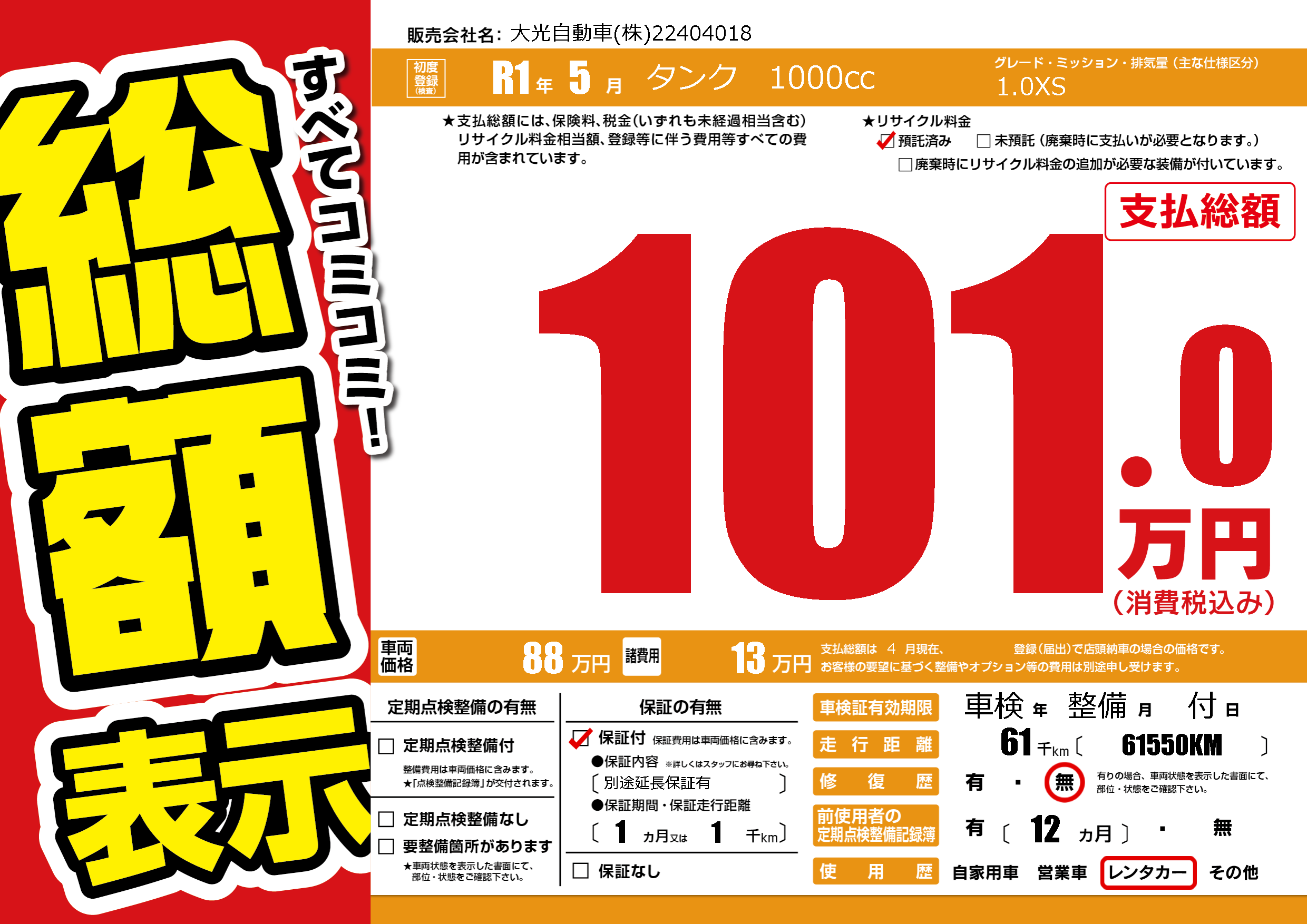 | 車名 | タンク 1000cc | グレード ミッション 排気量 |