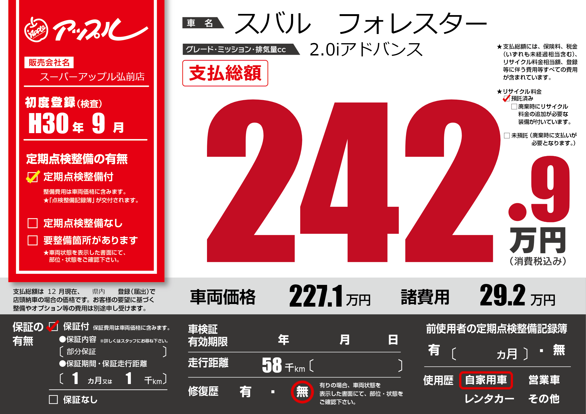 | 車名 | スバル フォレスター | グレード ミッション 排気量 |