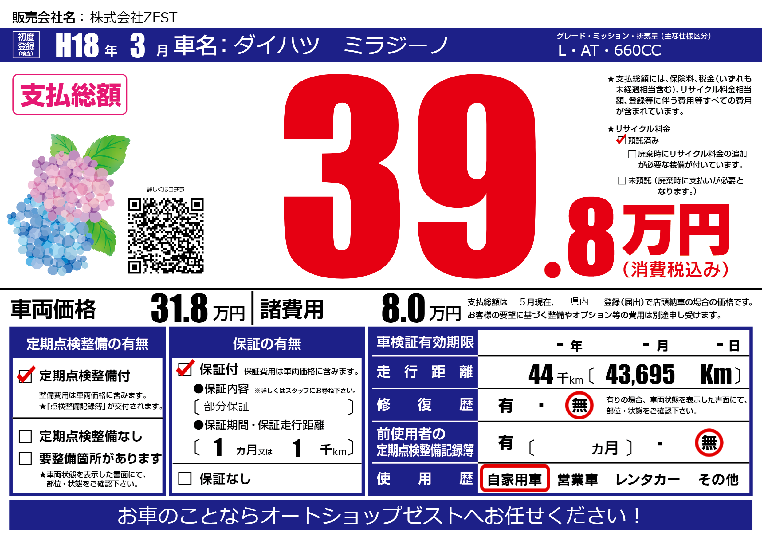 | 走行キロ | 4.4万km | 初年度登録 | H18年3月 |