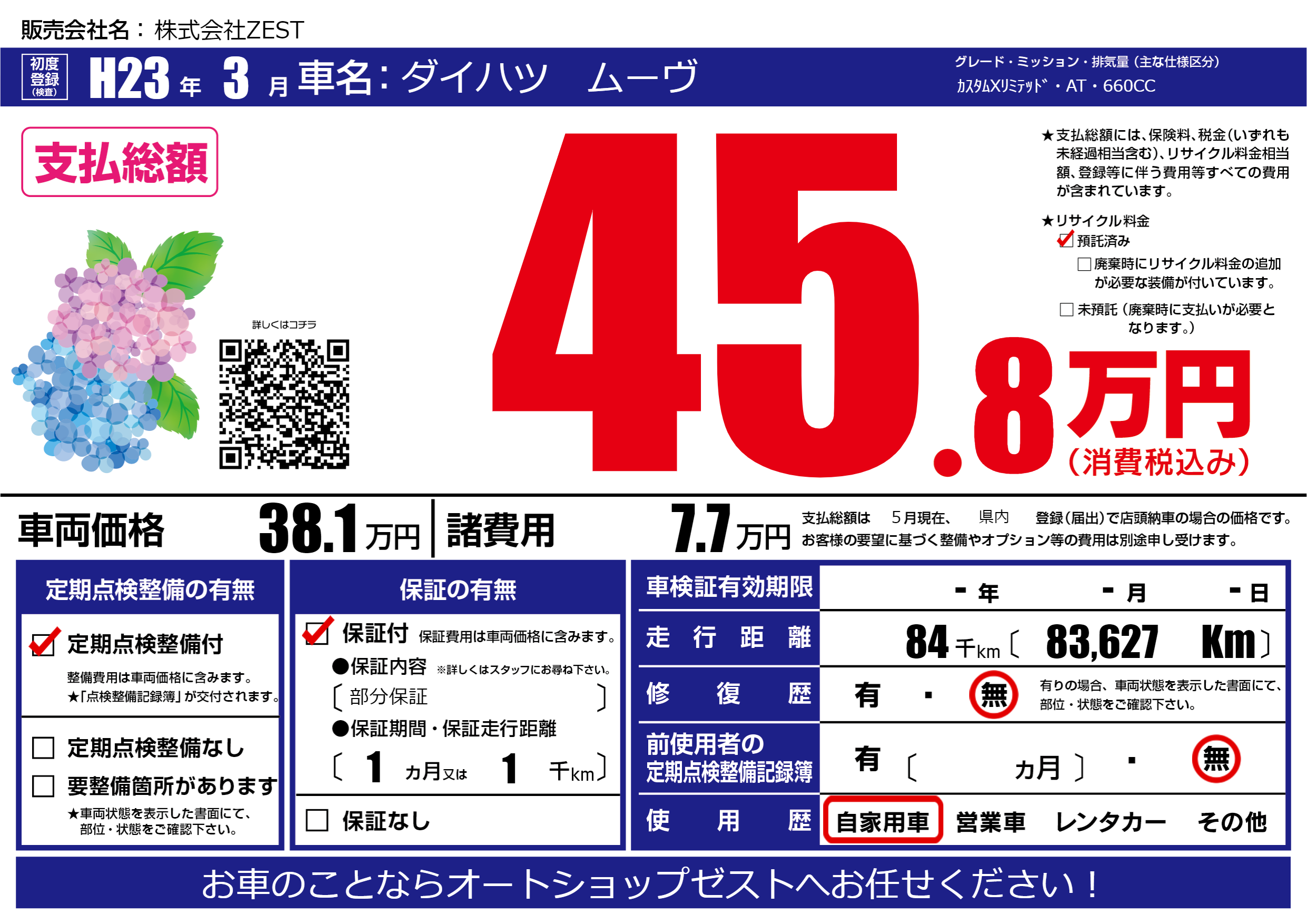 | 走行キロ | 8.4万km | 初年度登録 | H23年3月 |